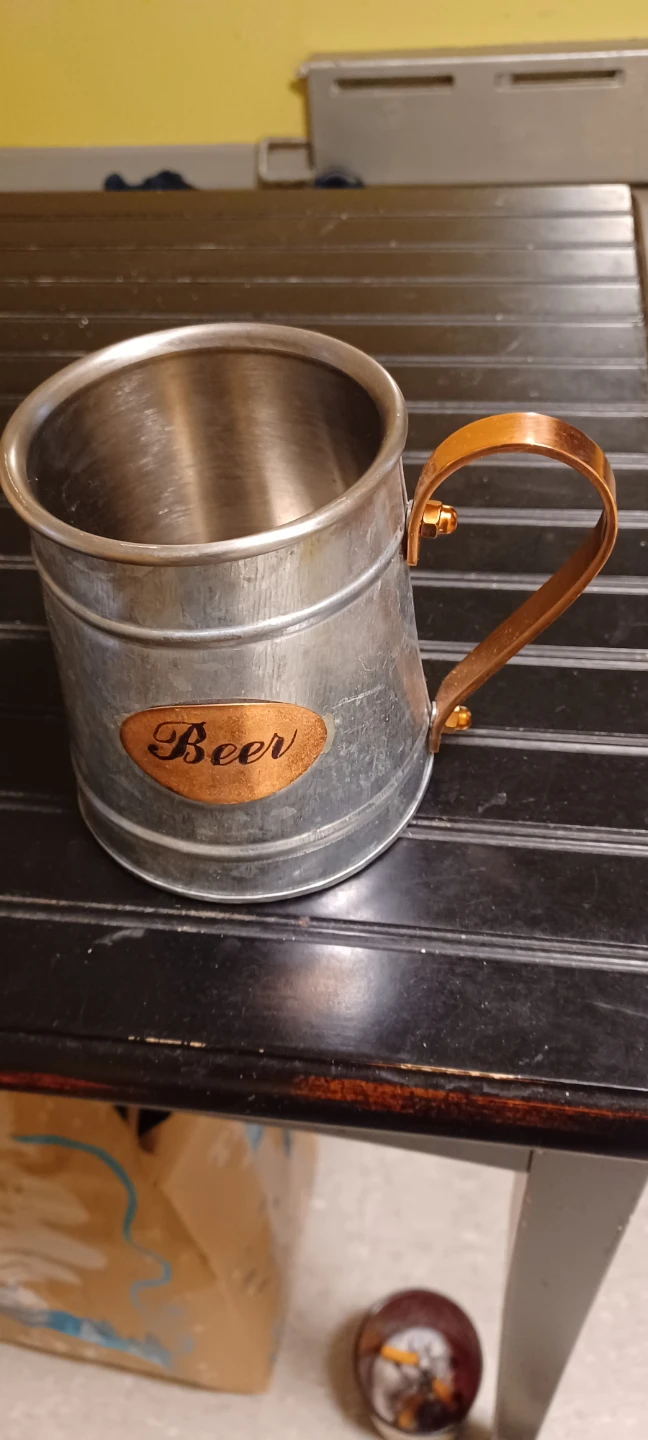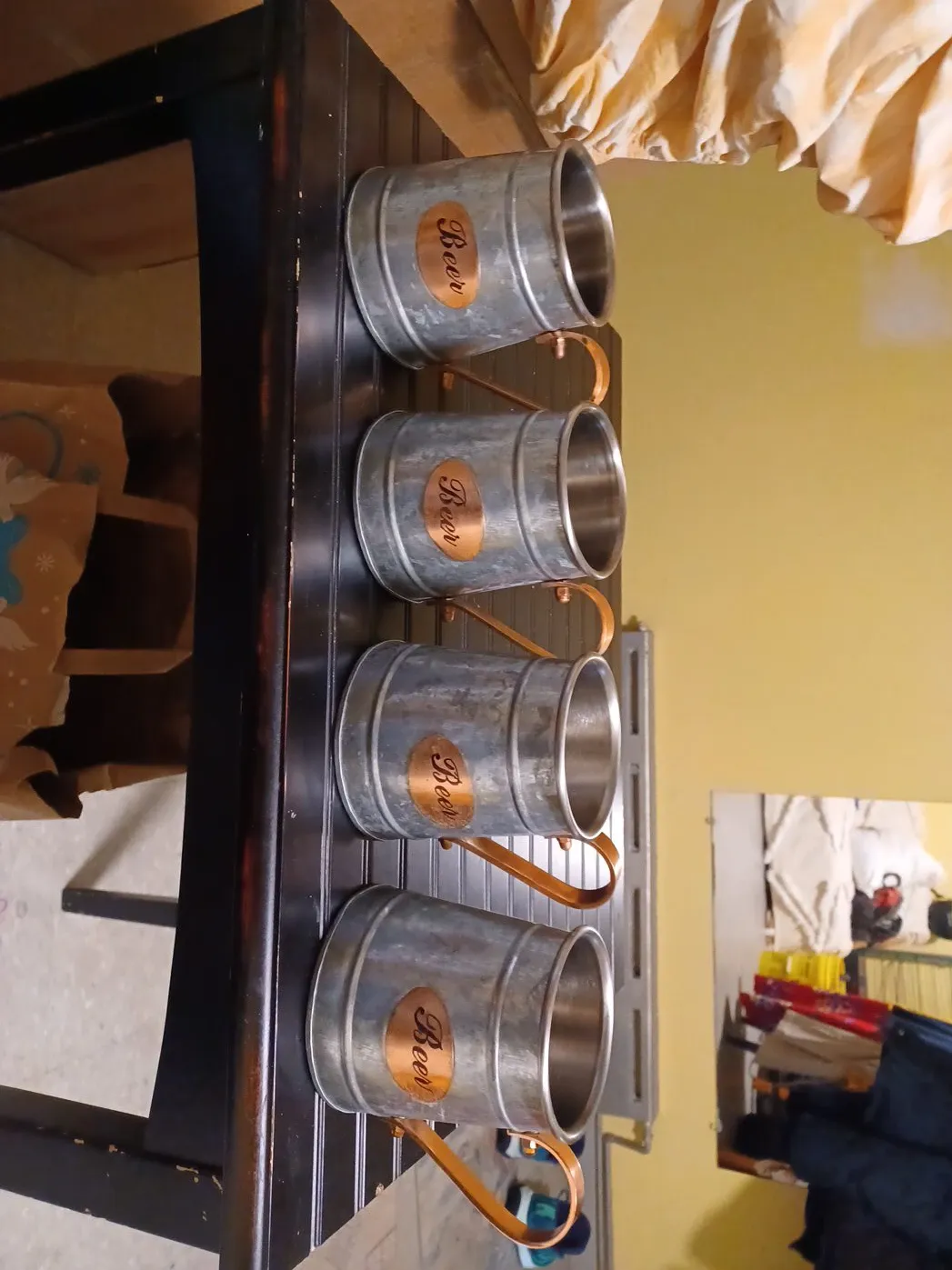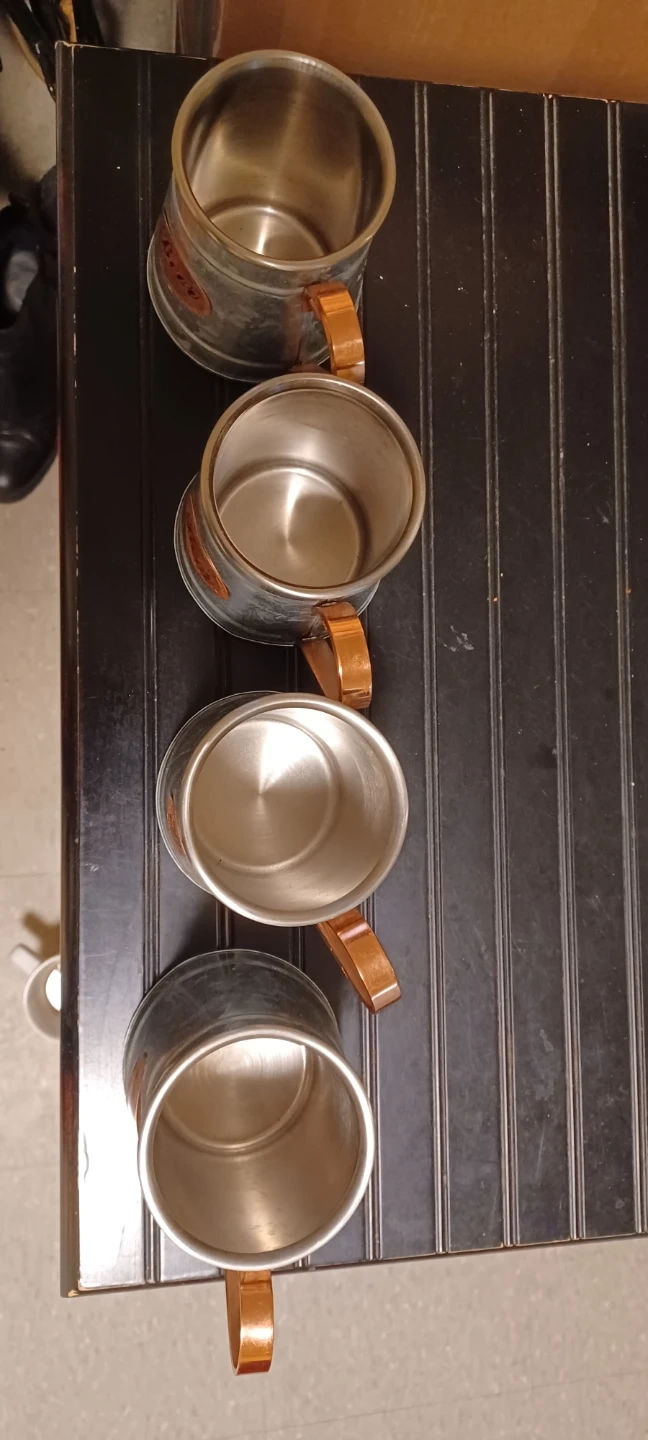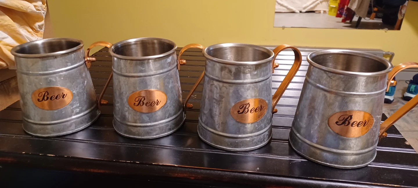 Selling a set of four beer mugs! They have a rustic, vintage look with a metal body and copper-colored handles. Perfect for your next get-together or to add some charm to your home bar