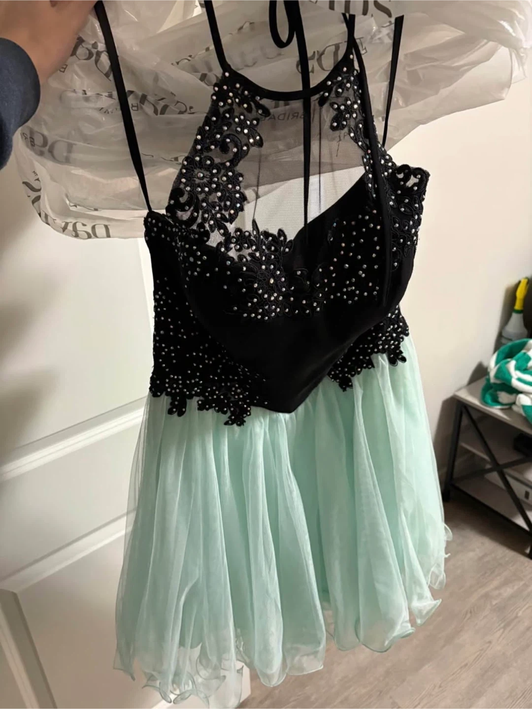 Selling a beautiful grad / prom dress. It features a black bodice with delicate lace detailing and a light turquoise tulle skirt. Perfect for prom or any special occasion!