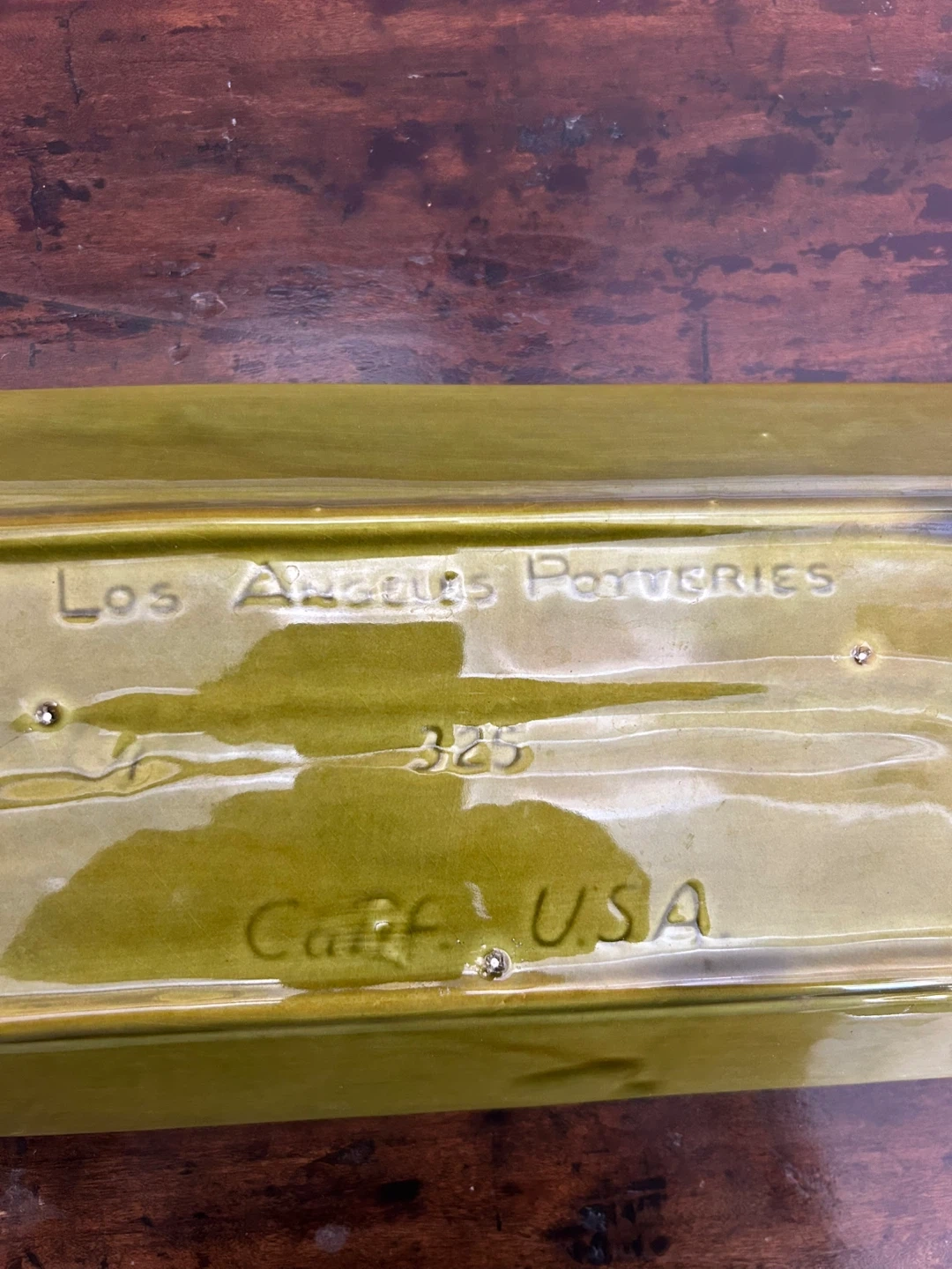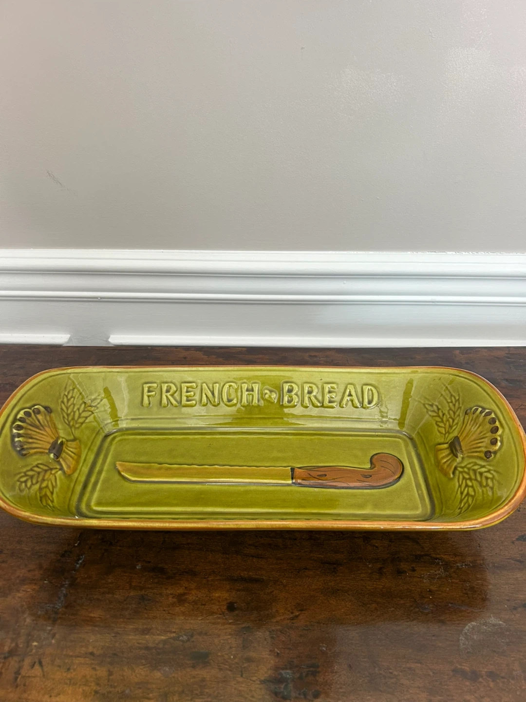 Selling a vintage Los Angeles Potteries French bread tray. It features a charming design with 'FRENCH BREAD' embossed on the surface, along with a knife illustration. The tray is marked 'Los Angeles Potteries' and 'Calif. USA' on the bottom, adding to its authenticity and collectible appeal