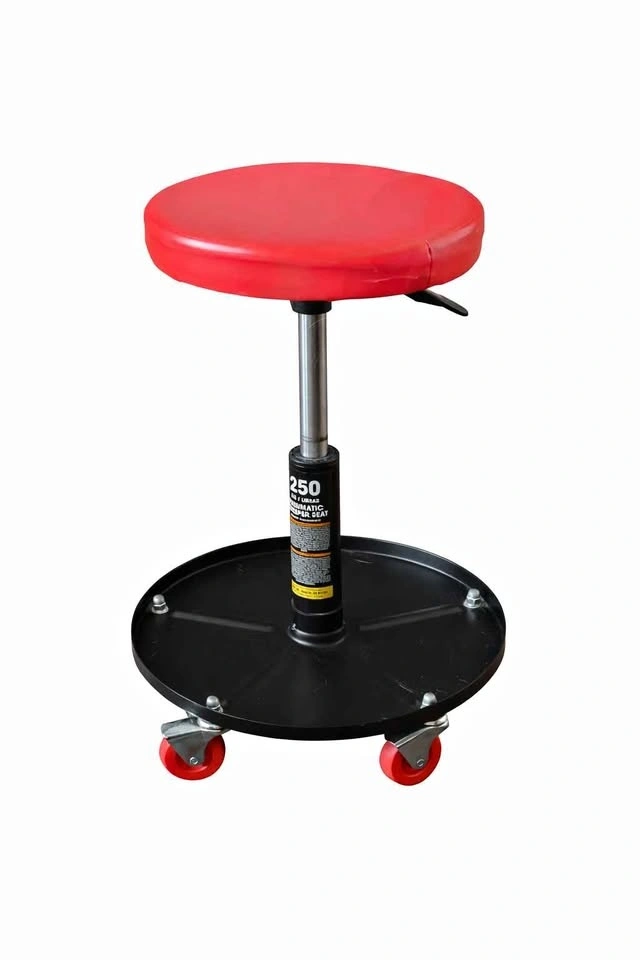 Sturdy rolling mechanic’s stool with pneumatic height adjustment. Comfortable padded seat, smooth-rolling caster wheels, and solid metal base with built-in tray for tools or parts.
