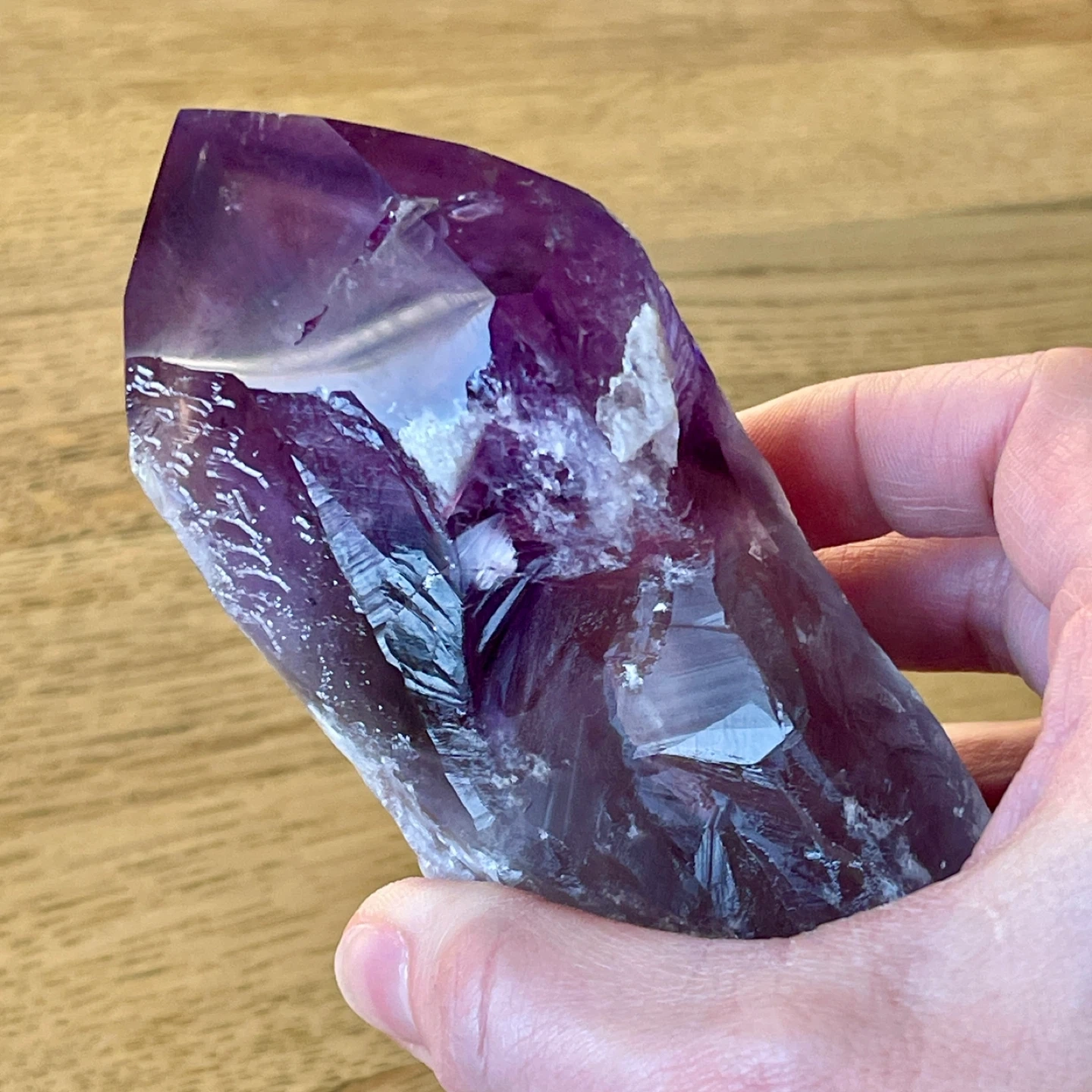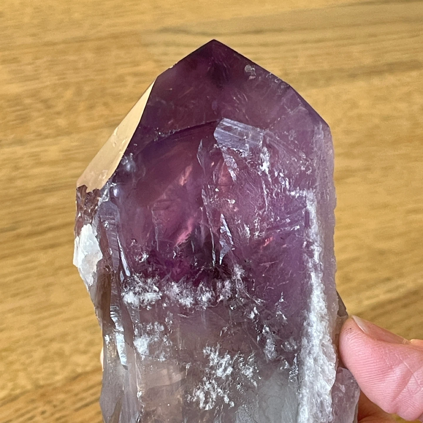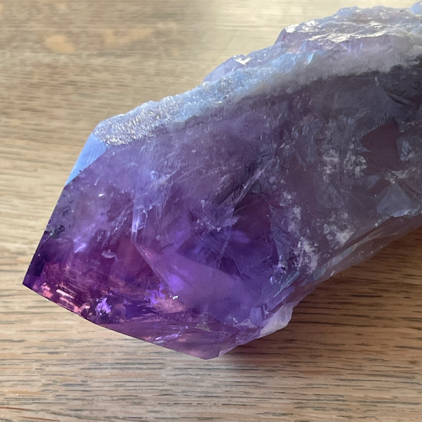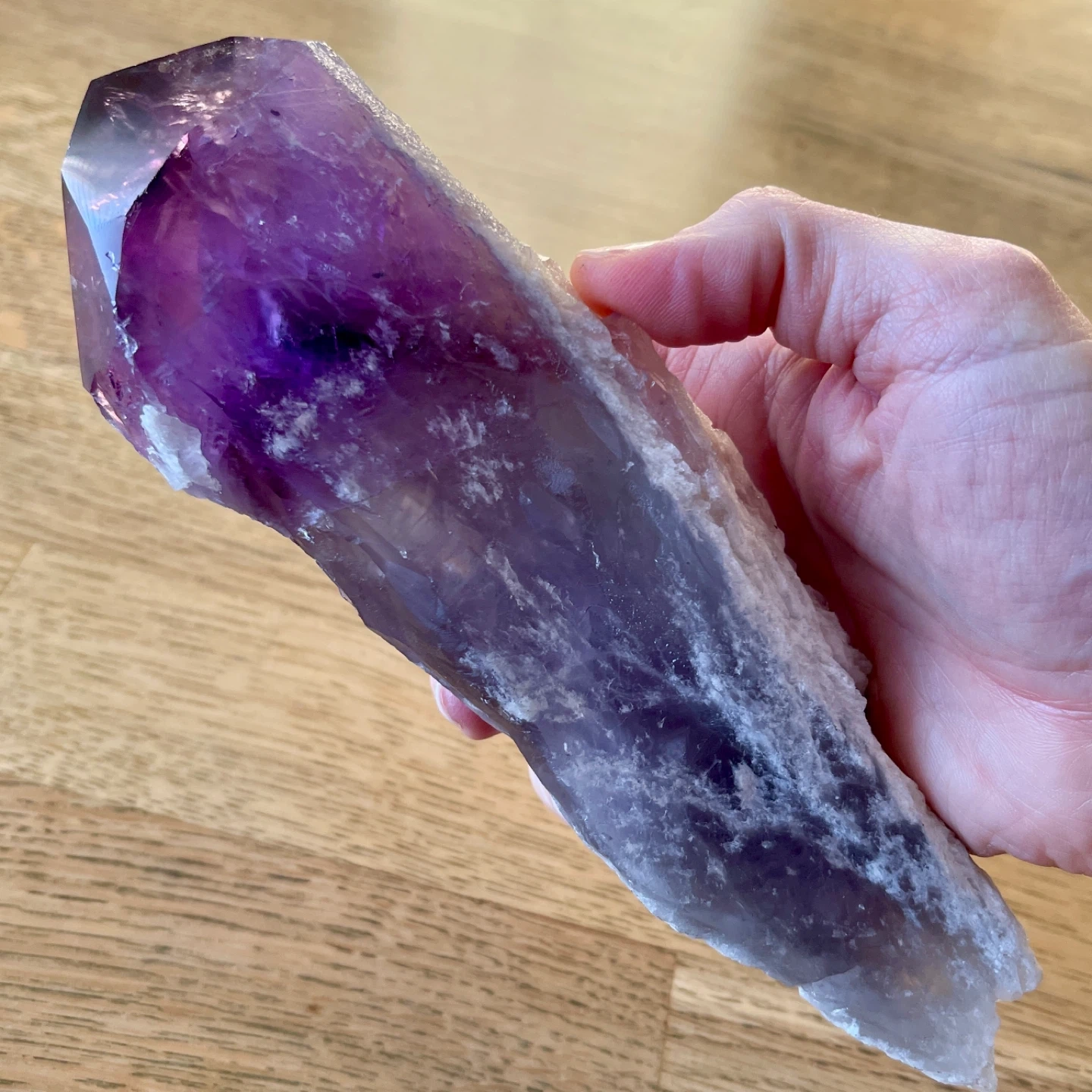 An amethyst scepter, or "torch" crystal, is a unique formation where a larger amethyst grows atop a smaller one, amplifying the stone's natural healing and protective energies for focused spiritual work, meditation, and channeling higher consciousness.