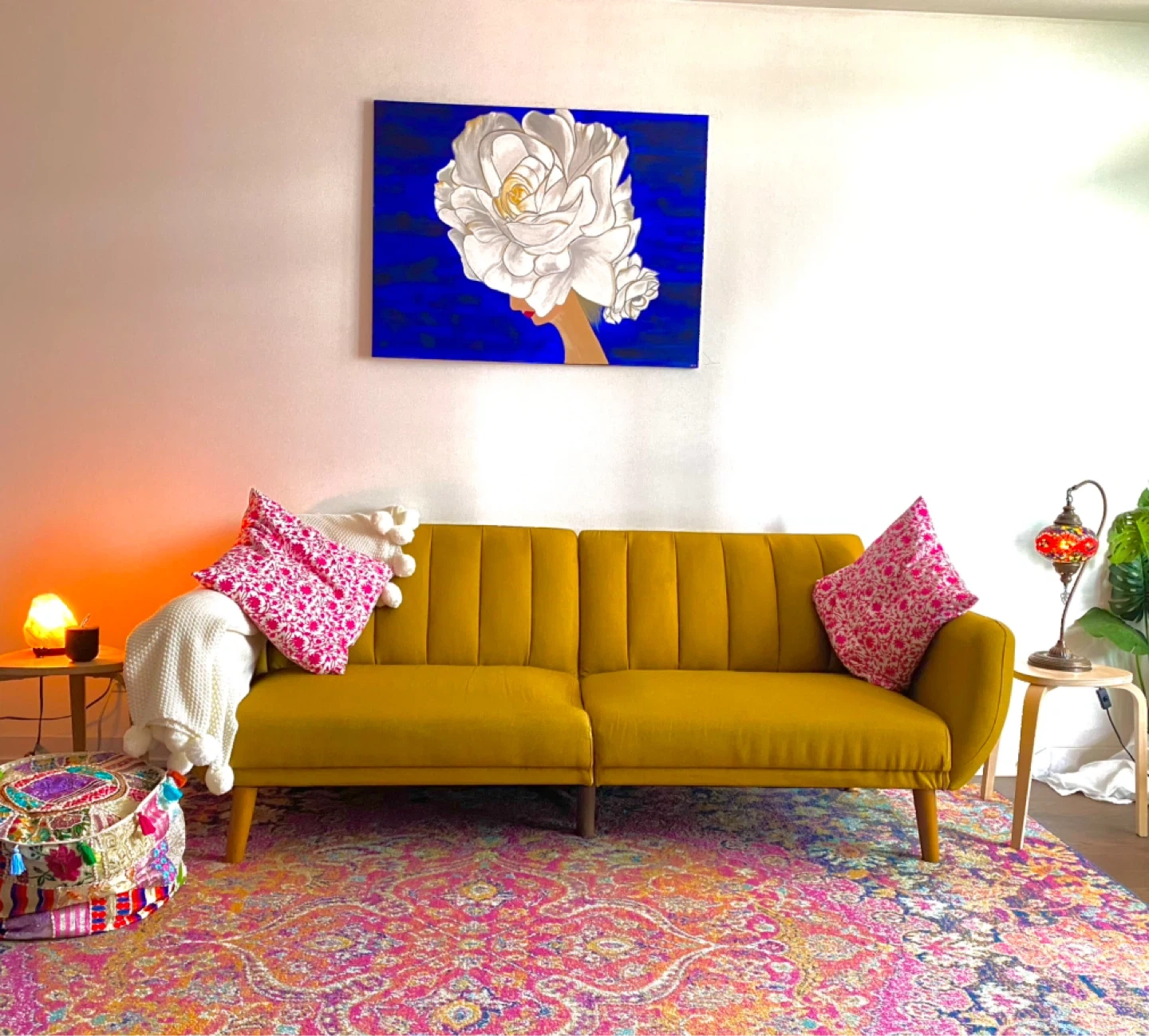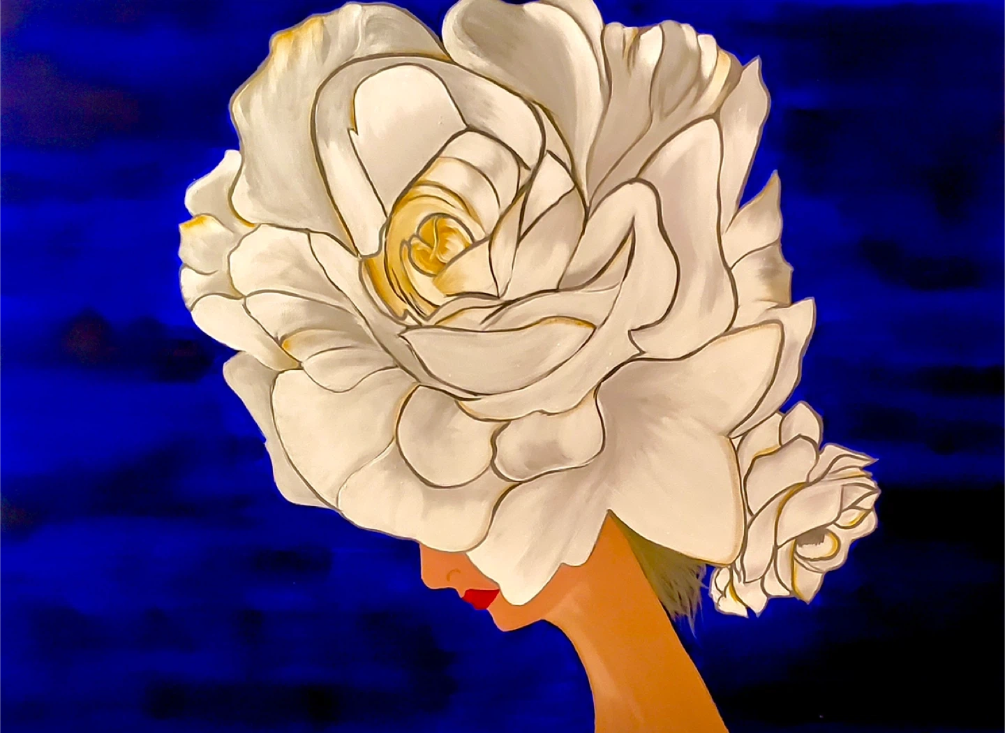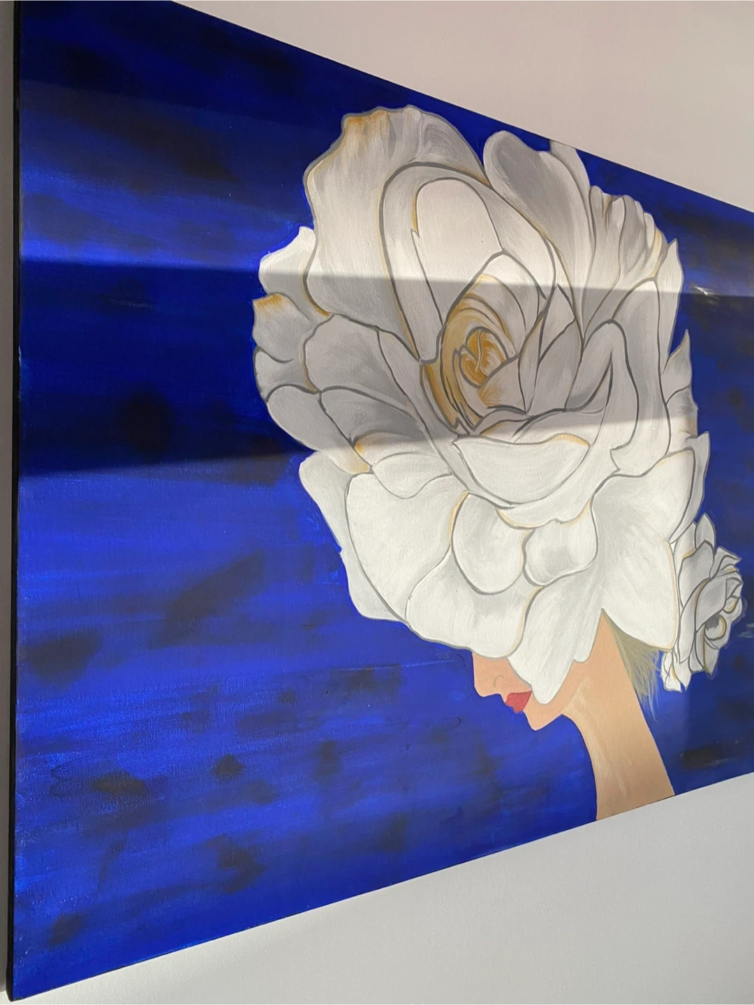 A beautiful painting, perfect for adding a touch of elegance to any room! The artwork features a striking white flower against a deep blue background. It's in great condition and ready to brighten up your space.