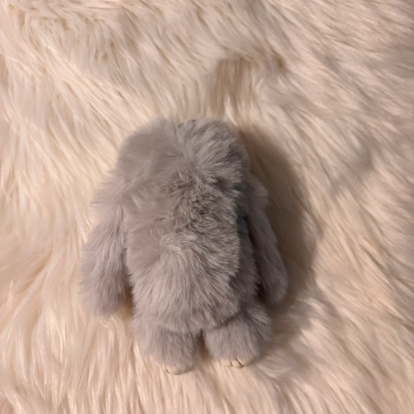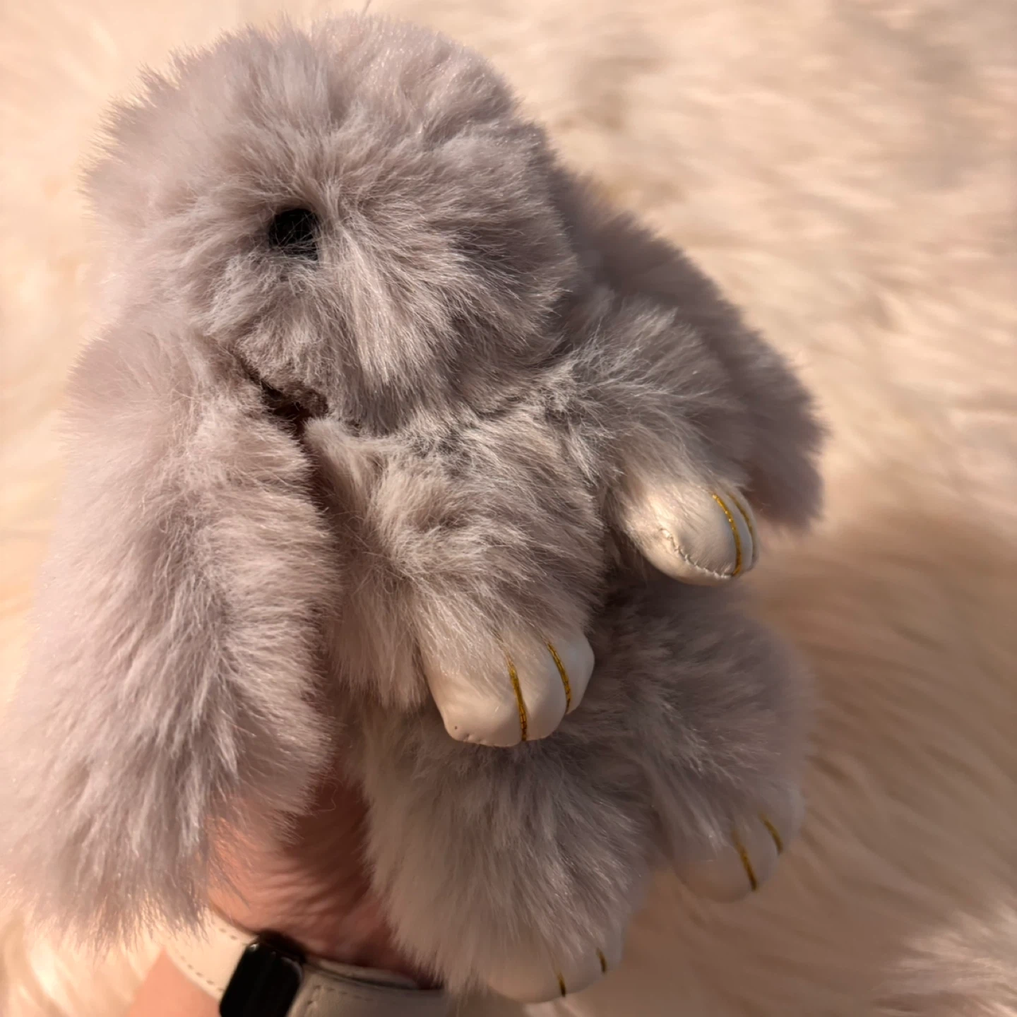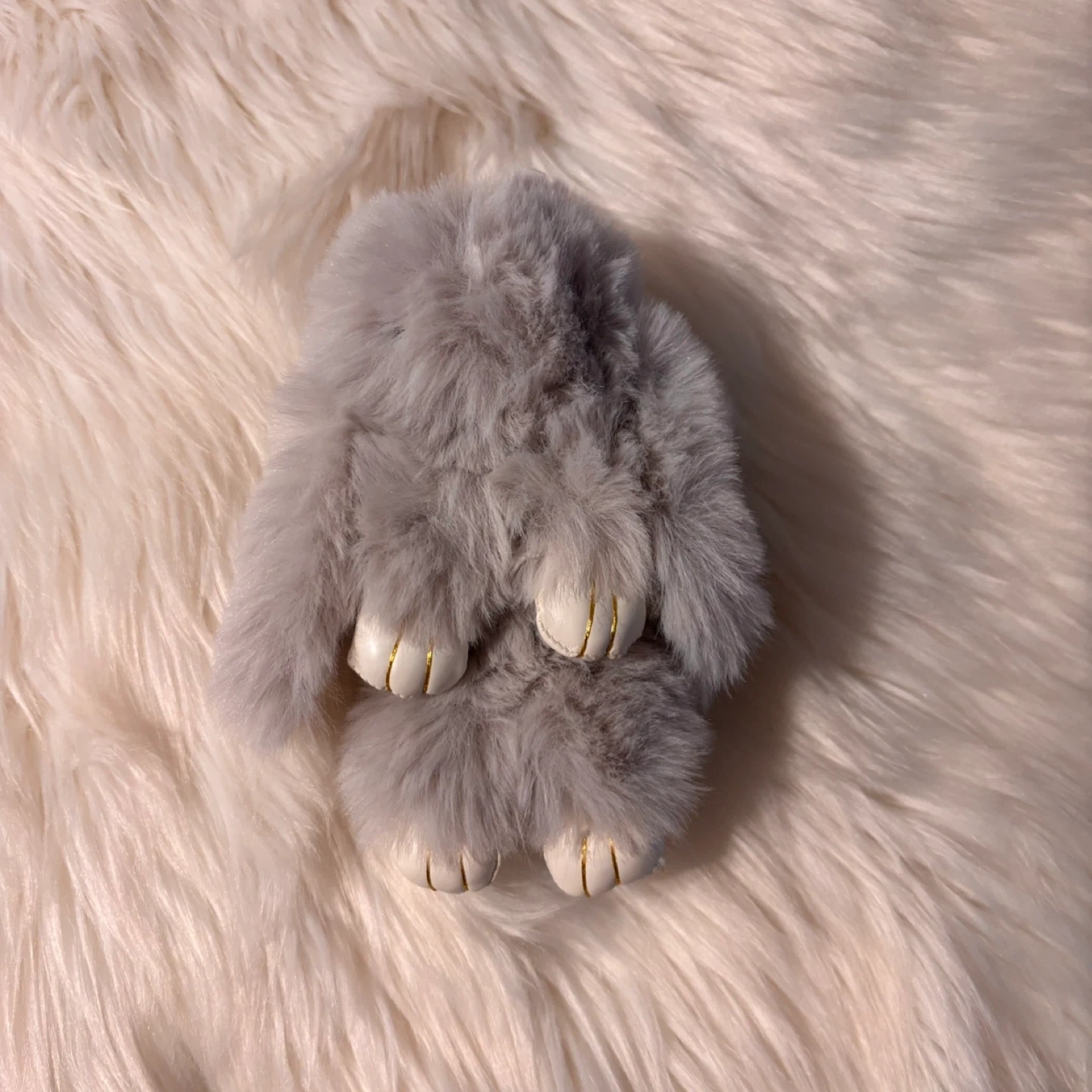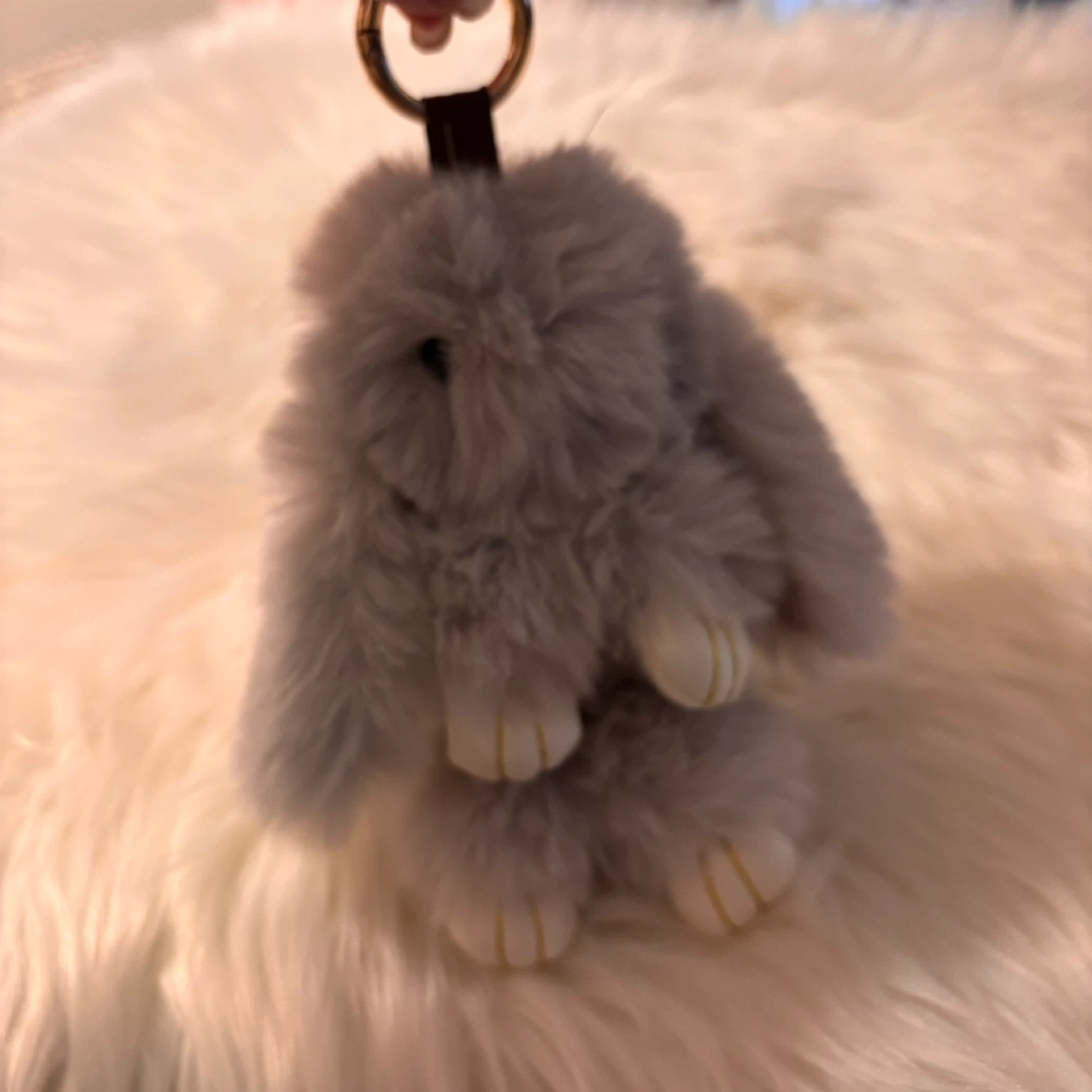 Here's a super cute grey fluffy bunny keychain! It's in great condition and ready to add some charm to your keys or bag