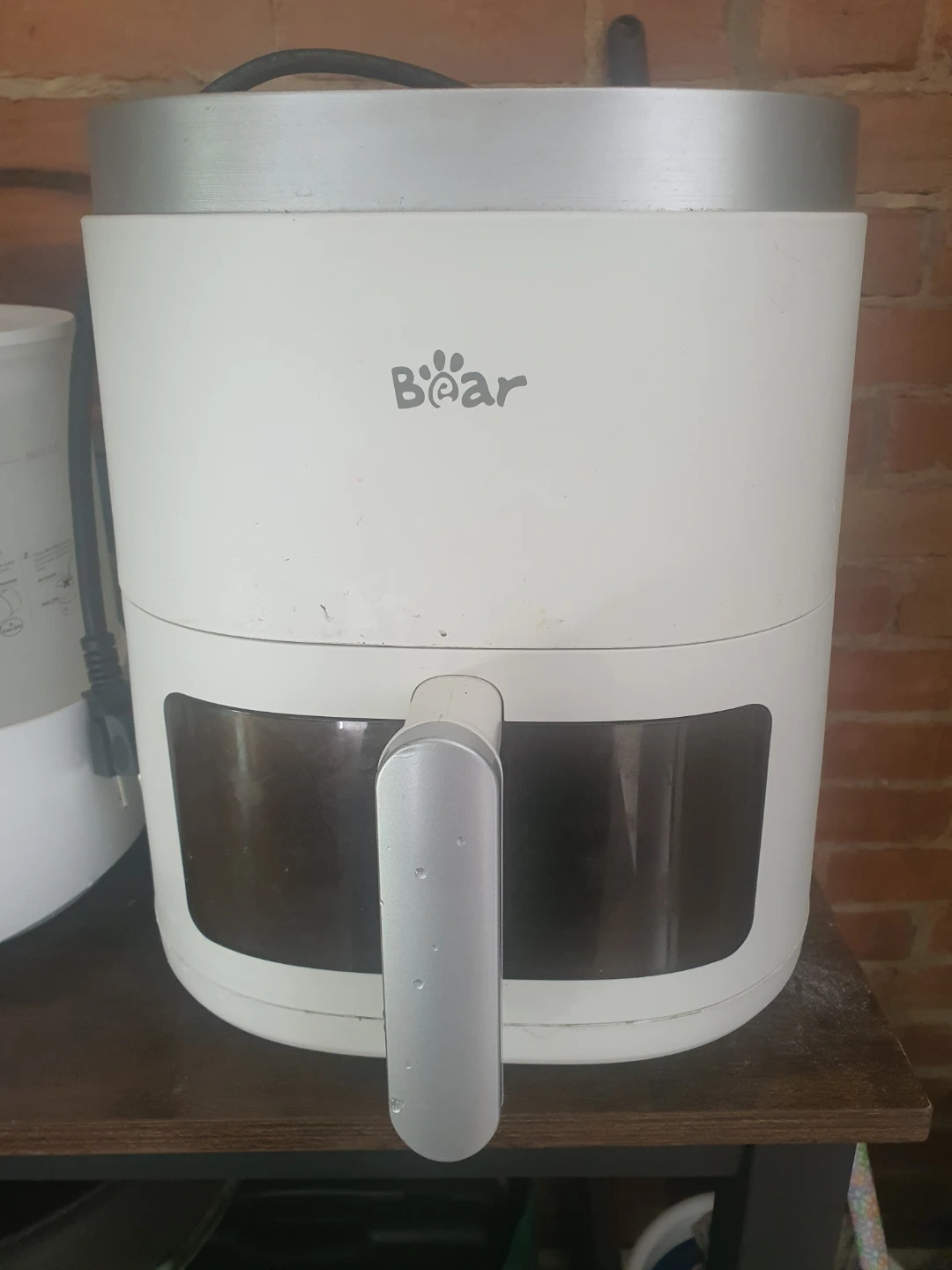 It's white with a silver handle and top. Great for making crispy snacks and meals quickly!
