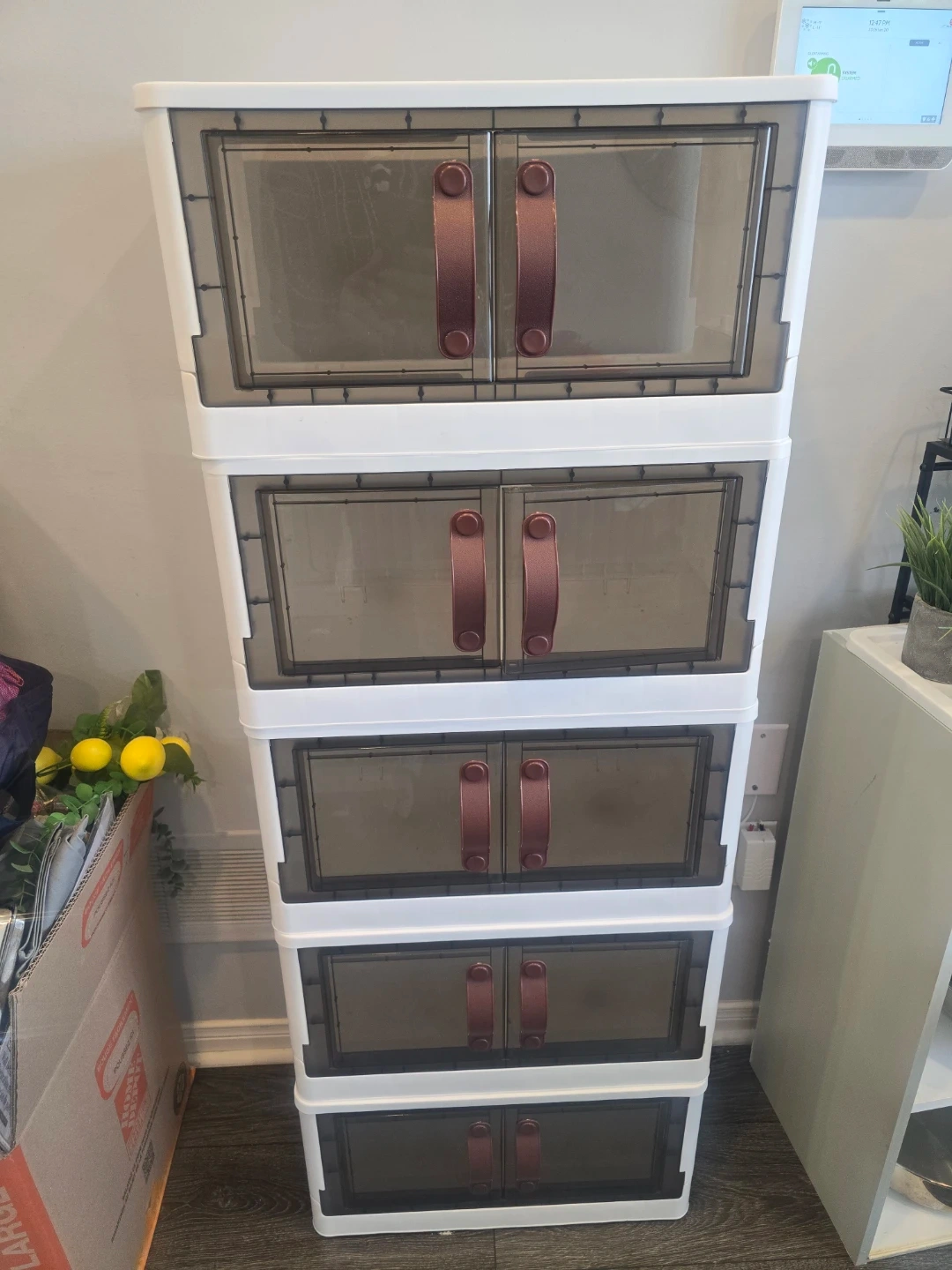 Selling a set of stackable storage bins. They're in great shape and ready to help you organize! The bins are white with brown handles and clear doors, making it easy to see what's inside. Perfect for any room in the house