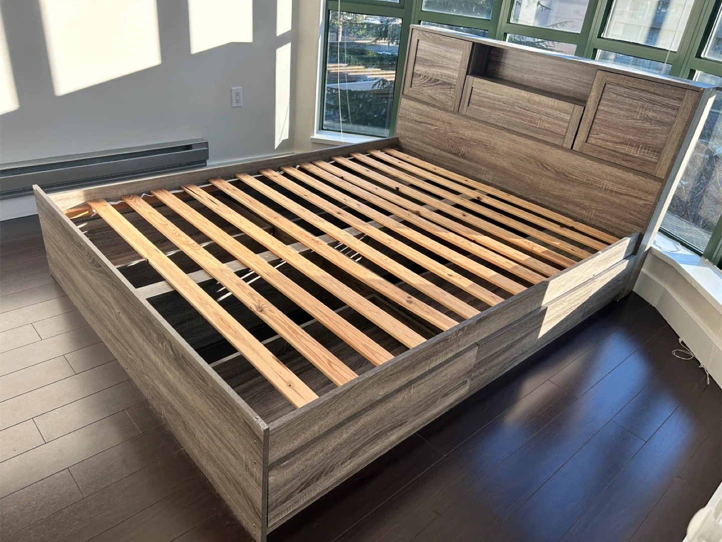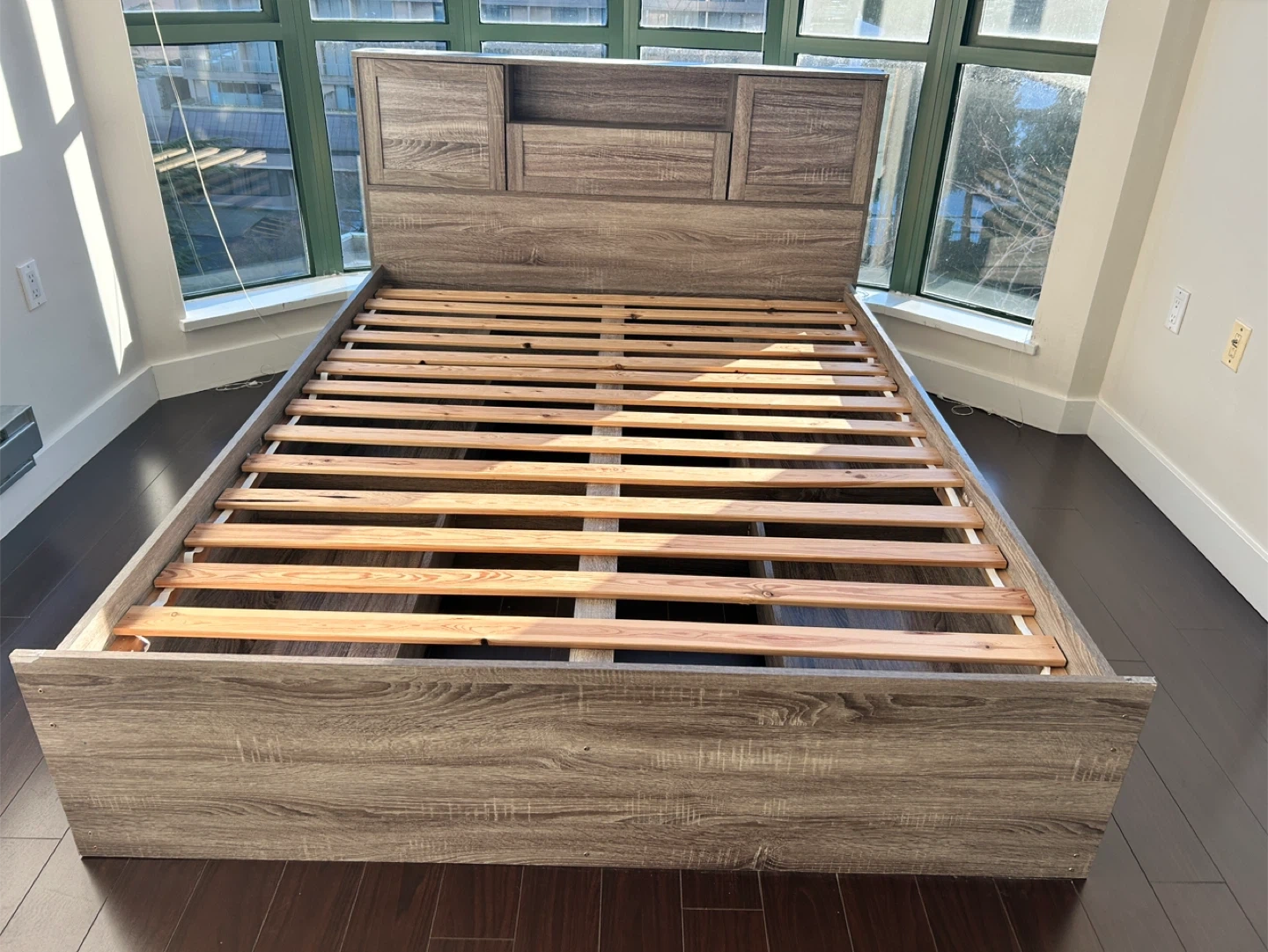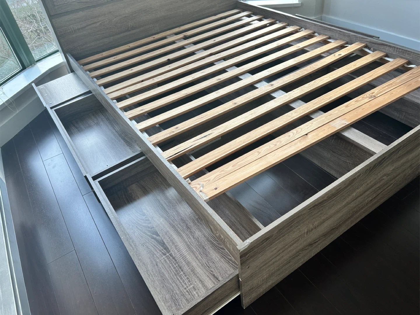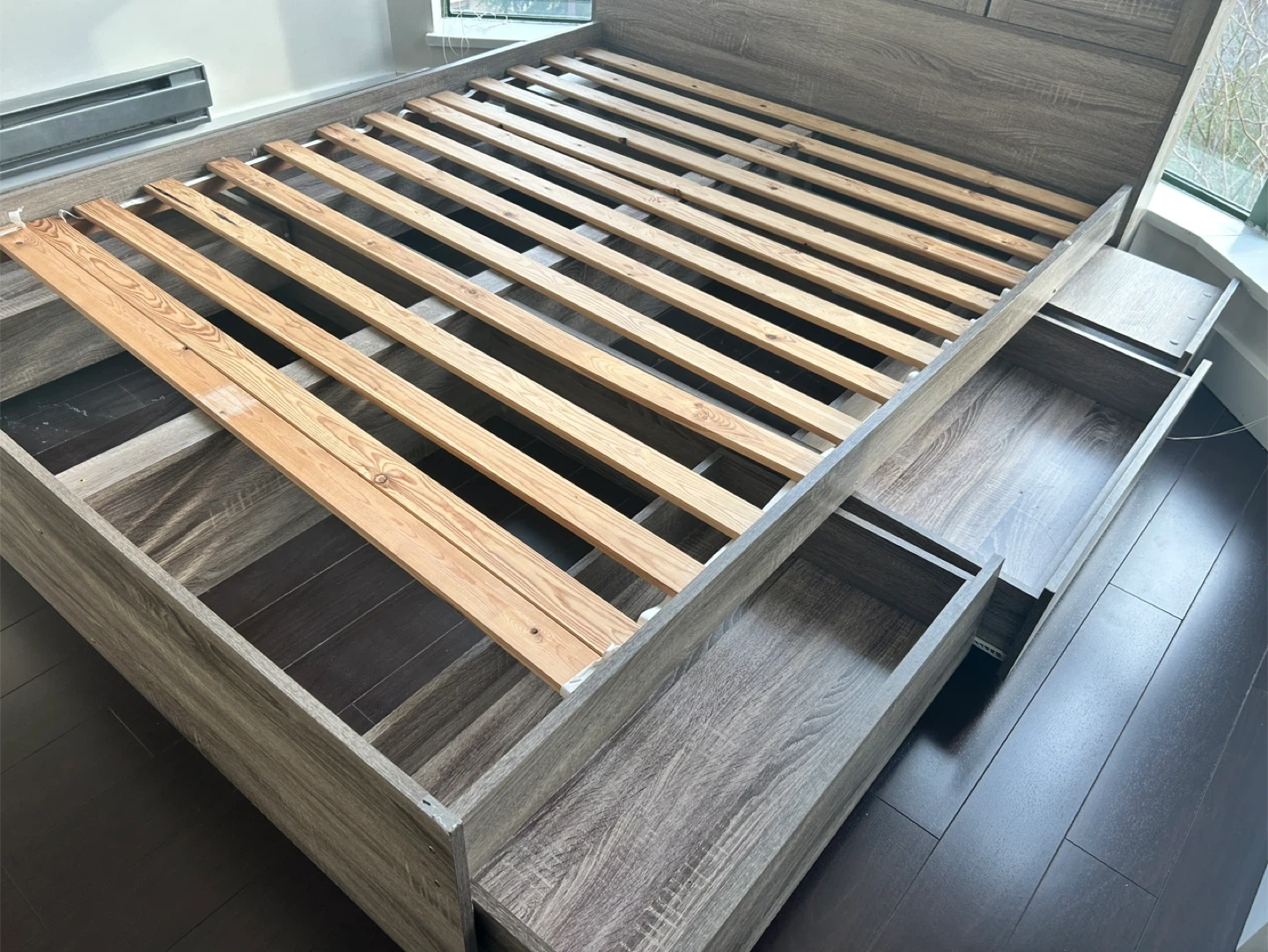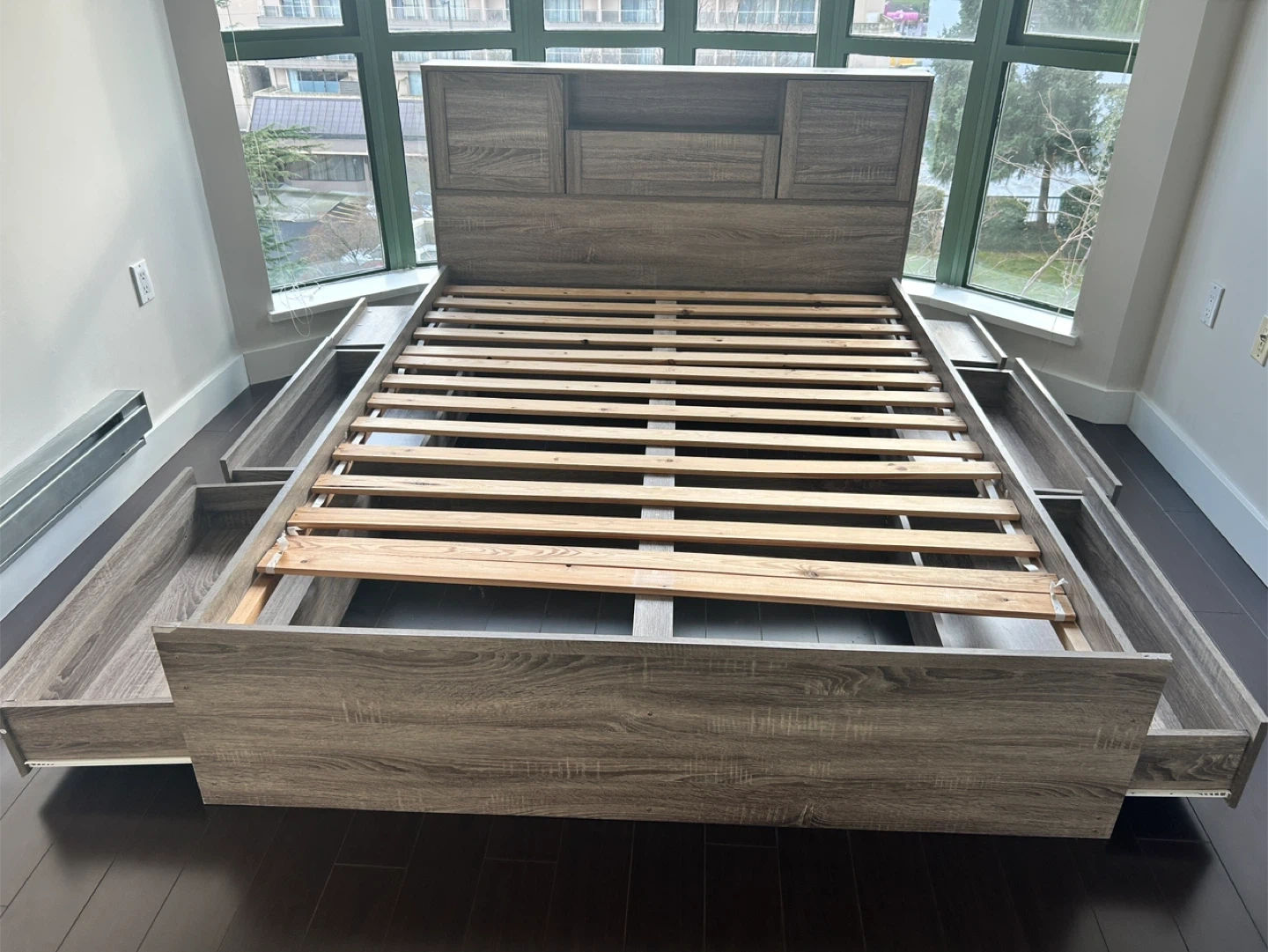 Selling a queen-size bed frame with built-in storage. It's in great shape and ready for a new home. Perfect for adding extra storage space to your bedroom!