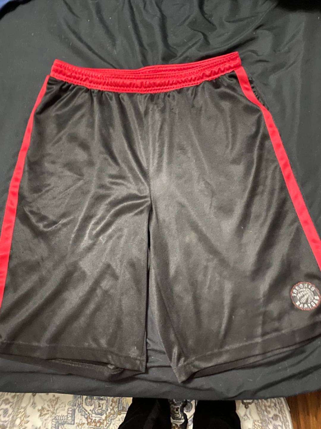 Selling a pair of Toronto Raptors basketball shorts. They are black with red trim and feature the Raptors logo. Great for playing ball or just lounging around!