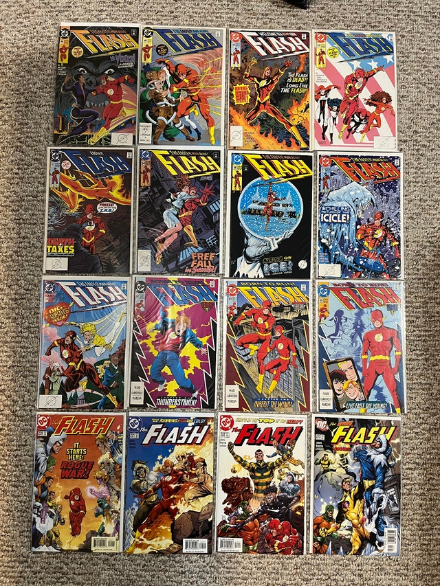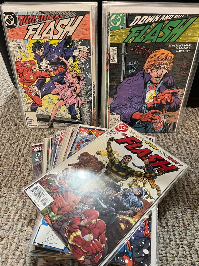 For sale is a lot of The Flash Comics. There are 37 comics in this lot. Most are high grade. Lots of good stuff here. Issue numbers are: The Flash (1987) 2, 4, 6, 8, 11, 13-15, 19, 20, 23, 26-29, 41, 46, 48, 50-52, 54, 56, 57, 59, 62, 63, 65, 220-225. Annual 4, 5. The Flash 12 (The Road to Flashpoint). Cash only. Pickup is in Etobicoke, near Queensway and Islington.