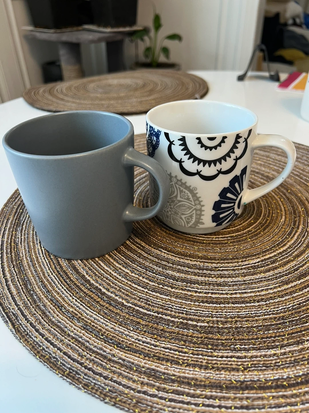 Two mugs to give away. One is a solid grey colour, and the other has a white base with a blue and black pattern. Both are in great condition and ready for your morning coffee or tea