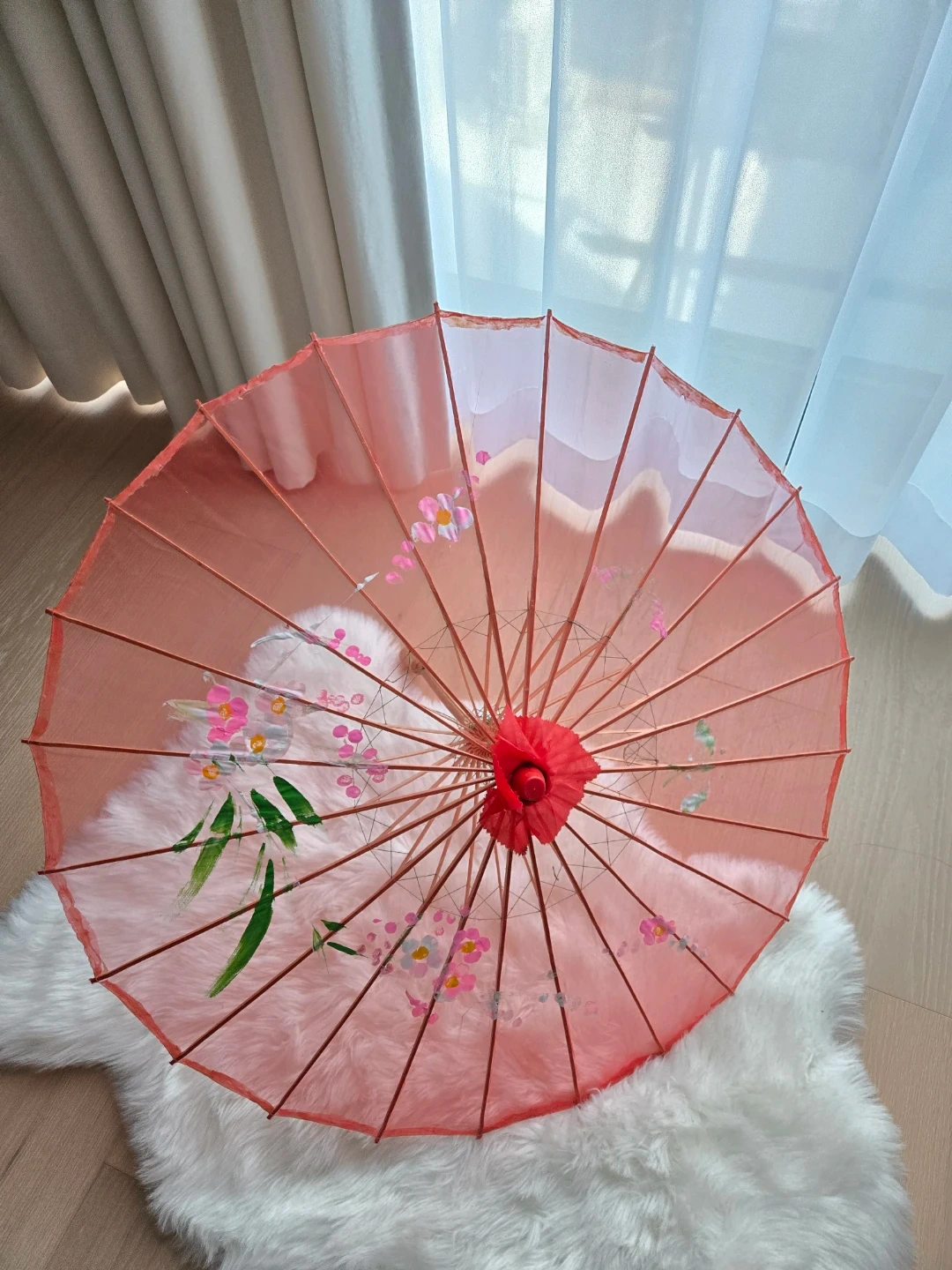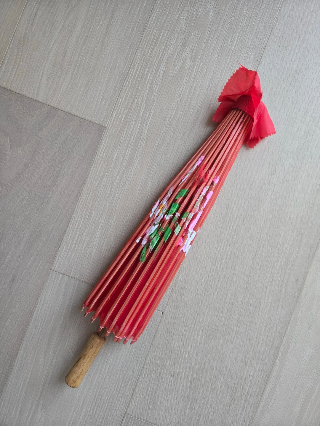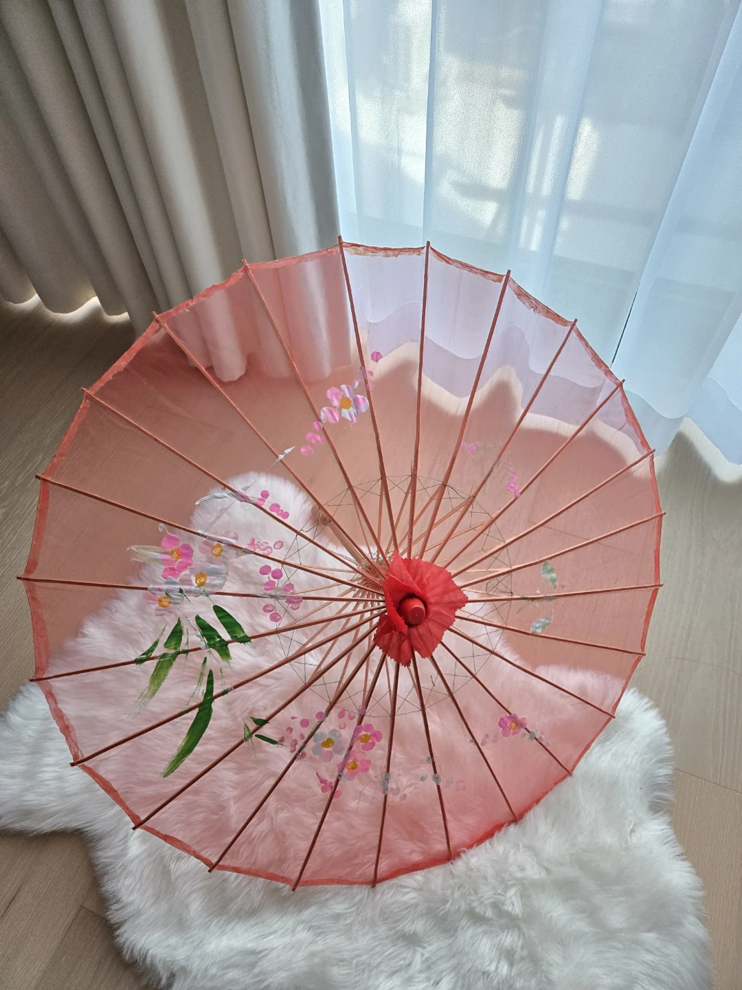 Beautiful red decorative parasol with floral designs! Perfect for adding a touch of elegance to any room or event