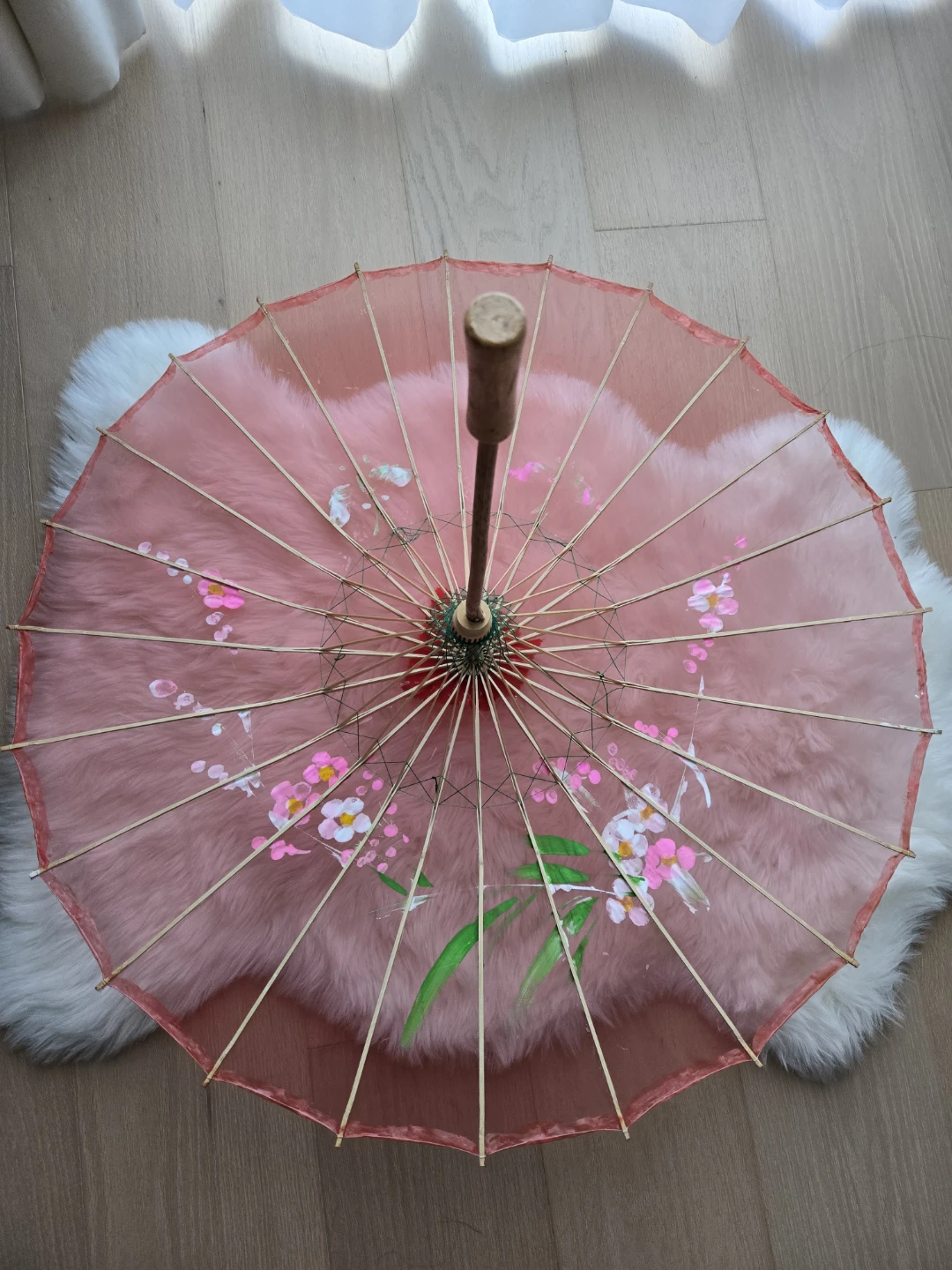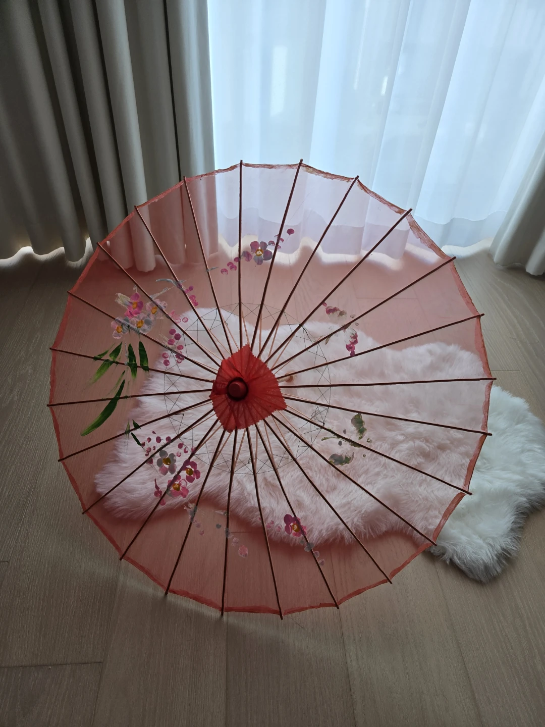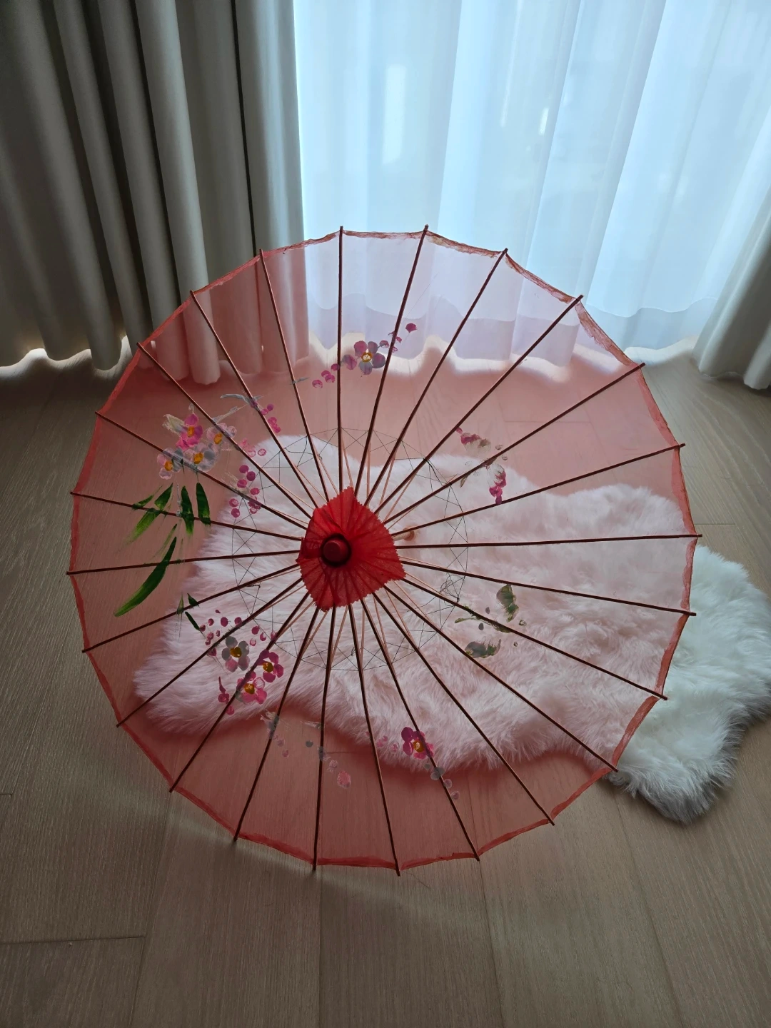 Beautiful red decorative parasol with floral designs! Perfect for adding a touch of elegance to any room or event