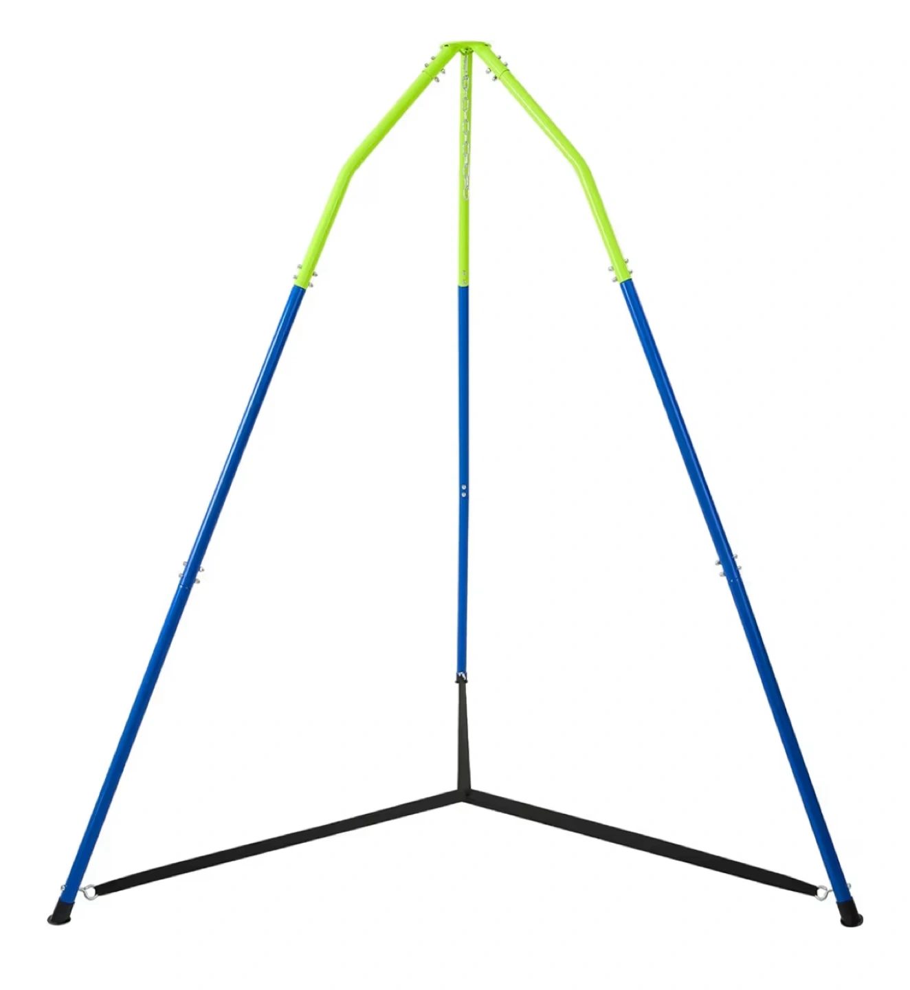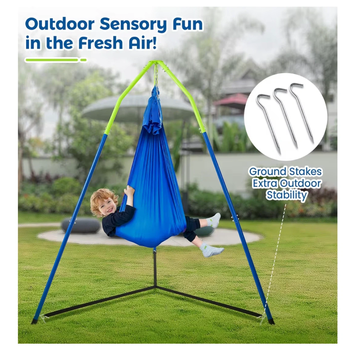 This swing stand is perfect for both indoor and outdoor use! It measures 84 inches (214cm) in height and comes with ground stakes for extra outdoor stability. The tubes are 1.4 inches (3.6cm) thick, making it very stable. It can also be used with a relaxing hammock, fabric pod swing, or sensory swing