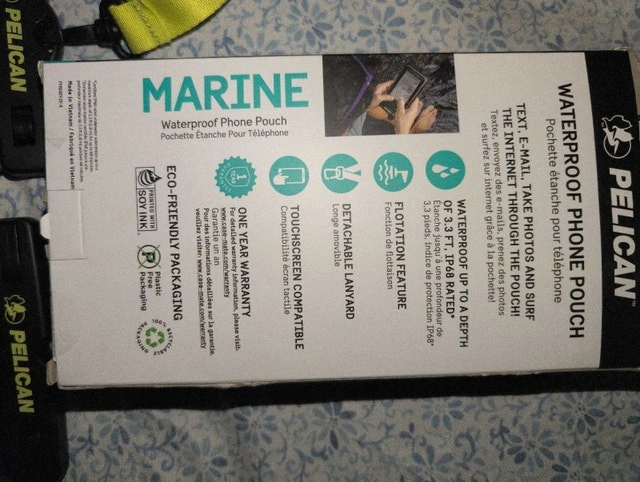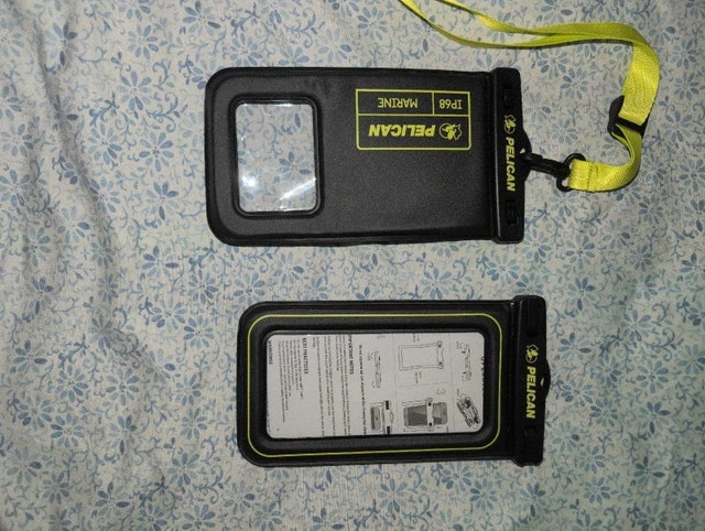 Keep your phone safe and dry with this Pelican Marine waterproof phone pouch. This pouch is rated IP68 waterproof to a depth of 3.3 feet, so you can take photos and surf the internet through the pouch. Key features: * IP68 Waterproof rated * Touchscreen compatible * Detachable lanyard * Flotation feature. They retail for around $50 CAD, so you're getting a good deal! If the ad is still up, it's still available! Each for $25 and two for $40
