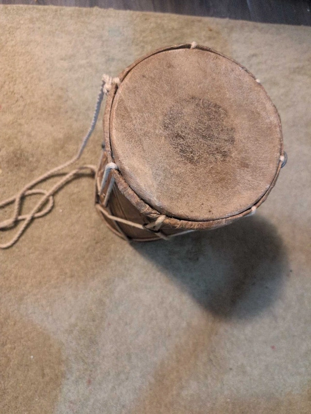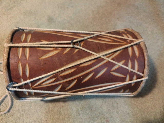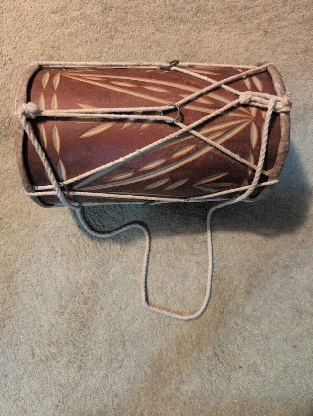 This is a used, beautifully hand-carved Dholak drum, perfect for adding an authentic sound to your music. It shows some signs of wear, which only adds to its vintage charm. This Dholak has a unique sound that is perfect for both beginners and experienced players. It's an instrument with a soul, ready to bring rhythm to your life. If the ad is up, the drum is available, so don't miss the beat!