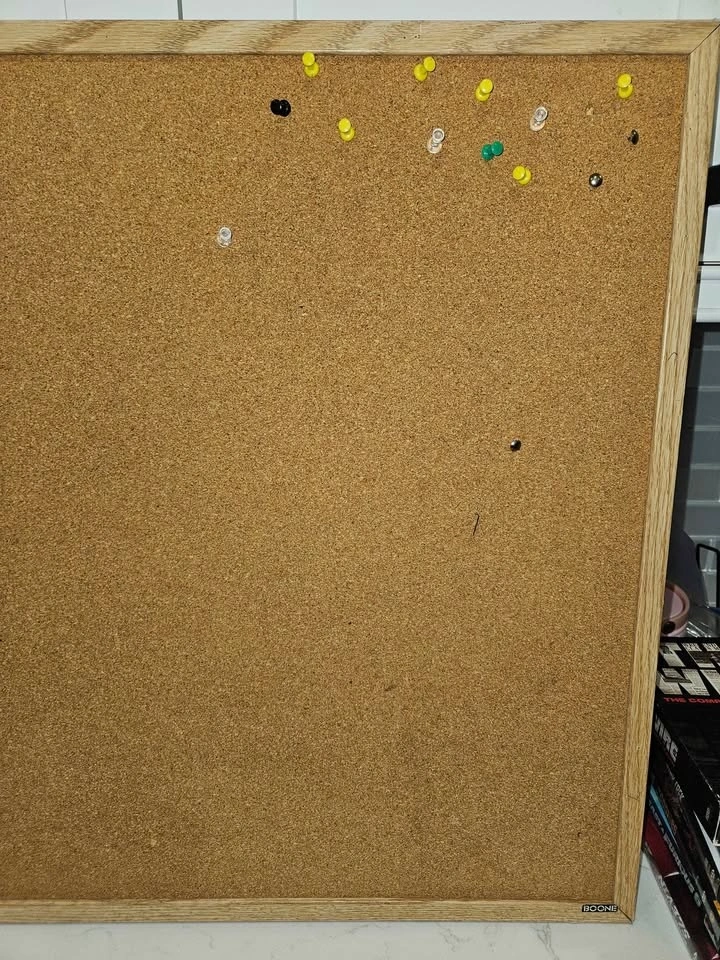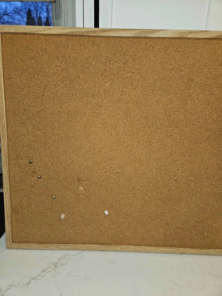Solid cork surface holds pins well. Frame is sturdy and clean. Some pinholes from normal use (see photos).