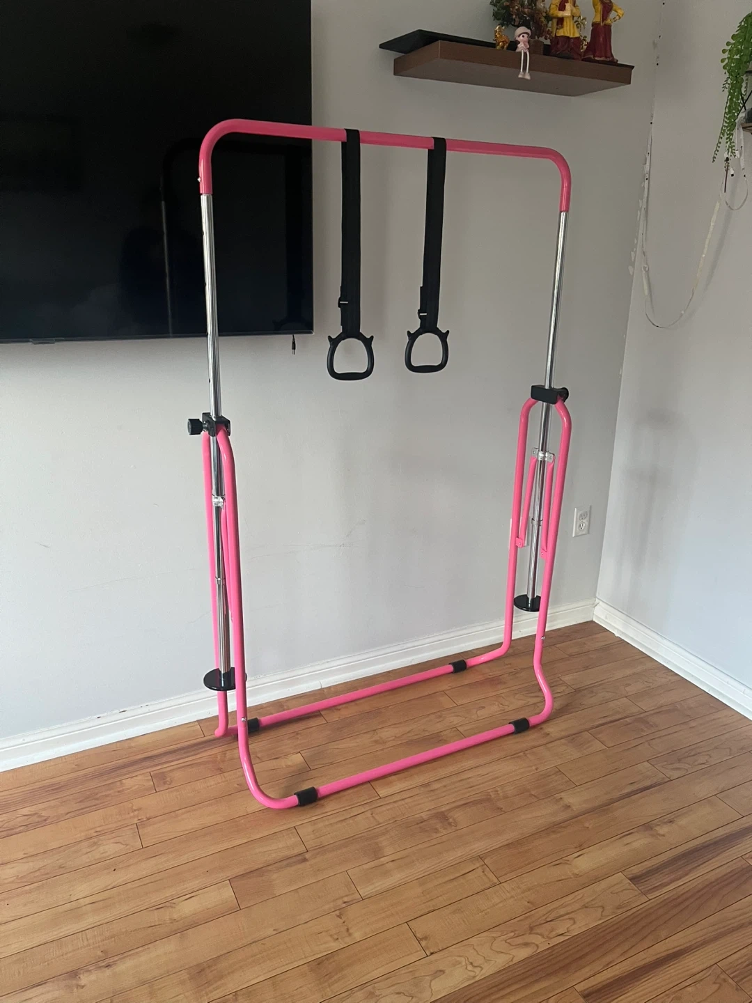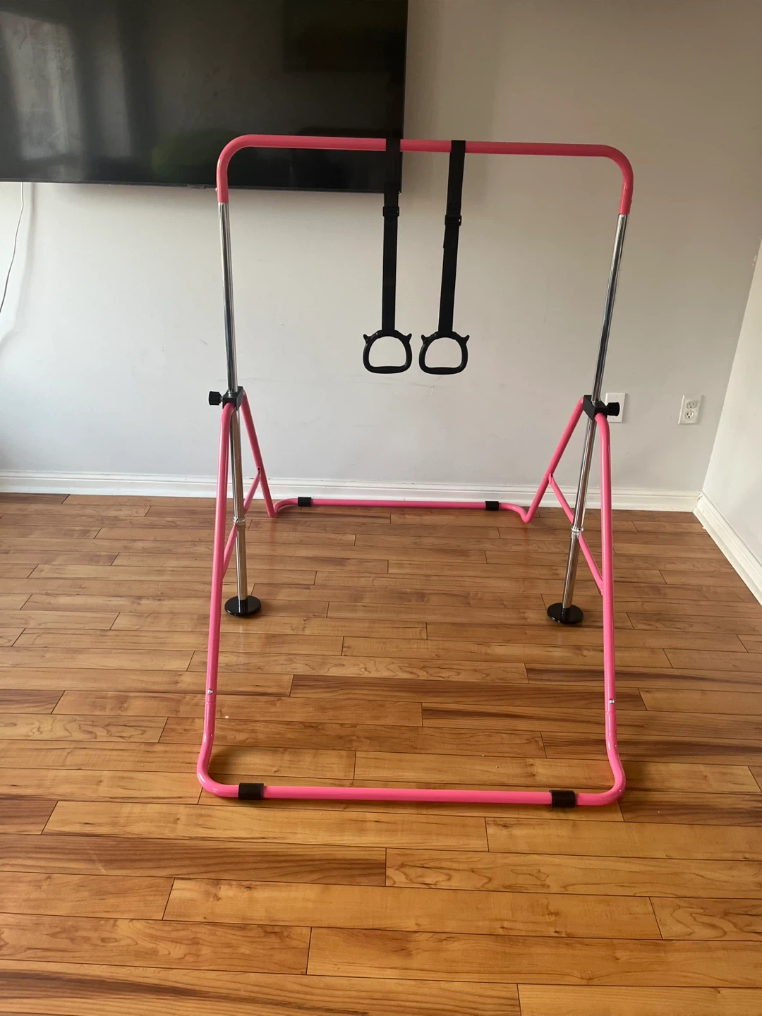 Selling a pink gymnastics bar with rings! It's in great condition and perfect for young gymnasts. The dimensions are approximately 41.3" (105cm) in height, 38.6" (98cm) in width, and 58.3" (148cm) in depth. Great for practicing at home!