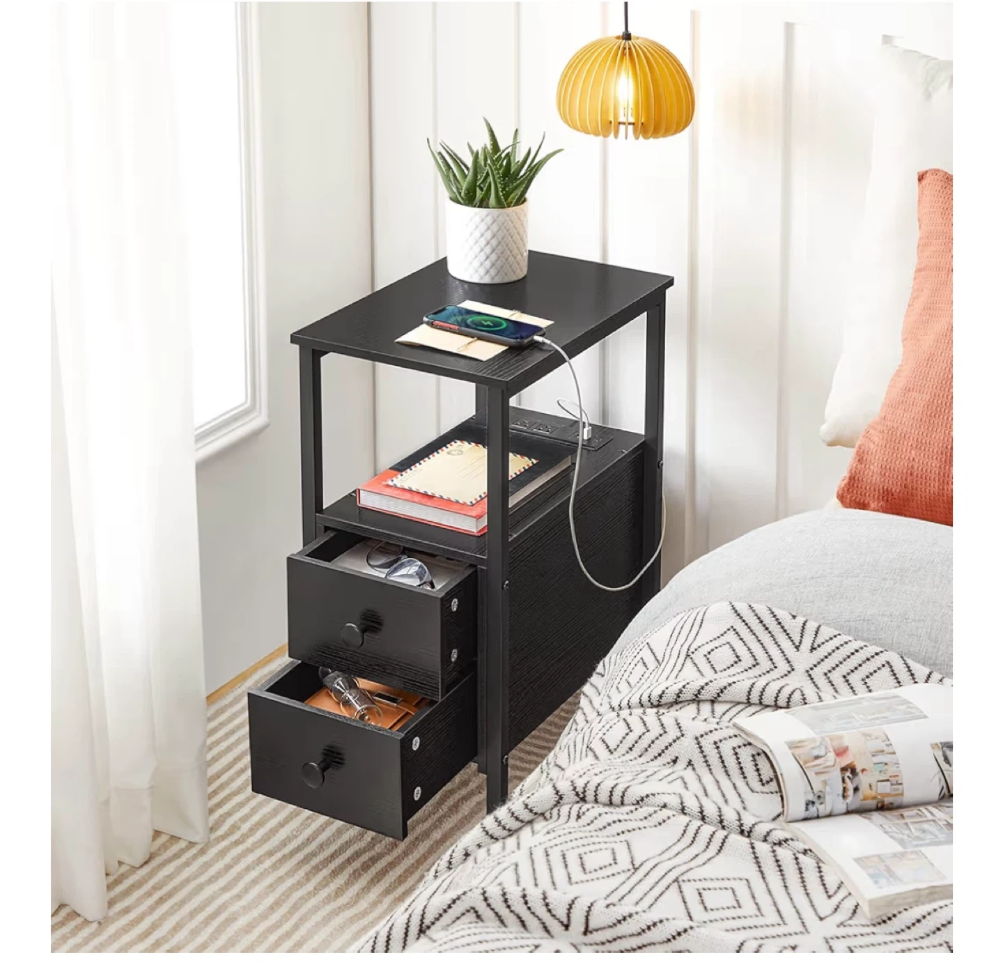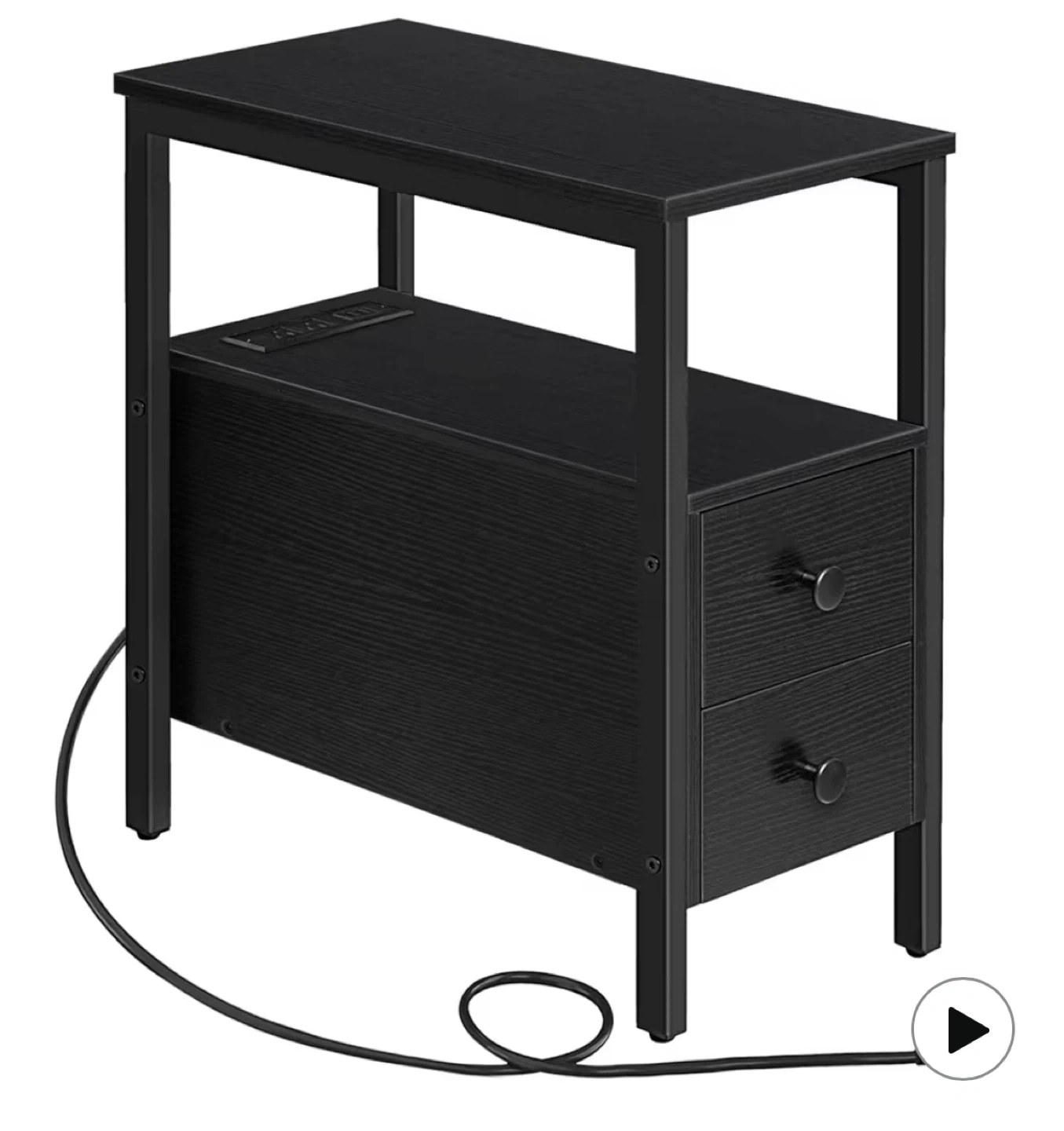 Looking to sell this handy black end table! It comes with a built-in charging station, perfect for keeping your devices powered up. It also has two drawers for extra storage. Dimensions are approximately 24" high, 18.9" wide, and 11.8" deep