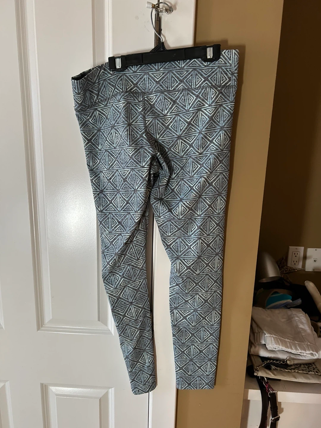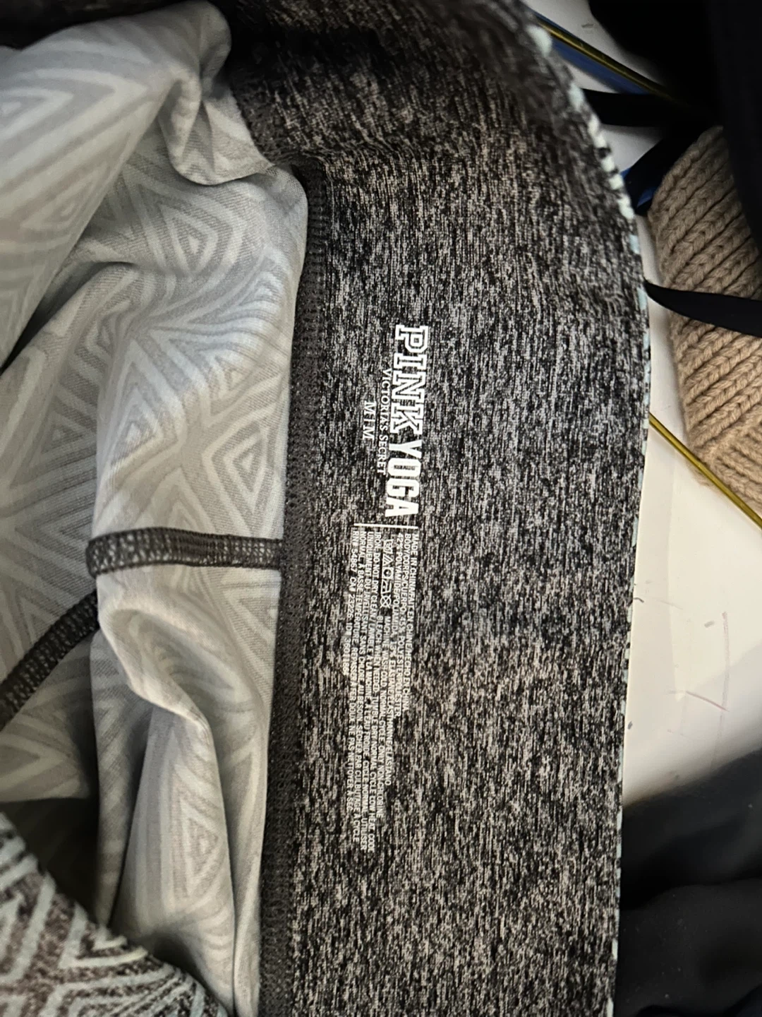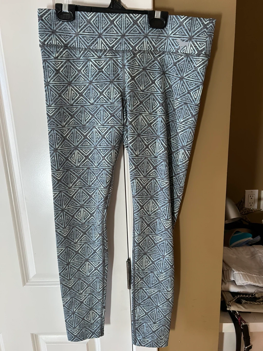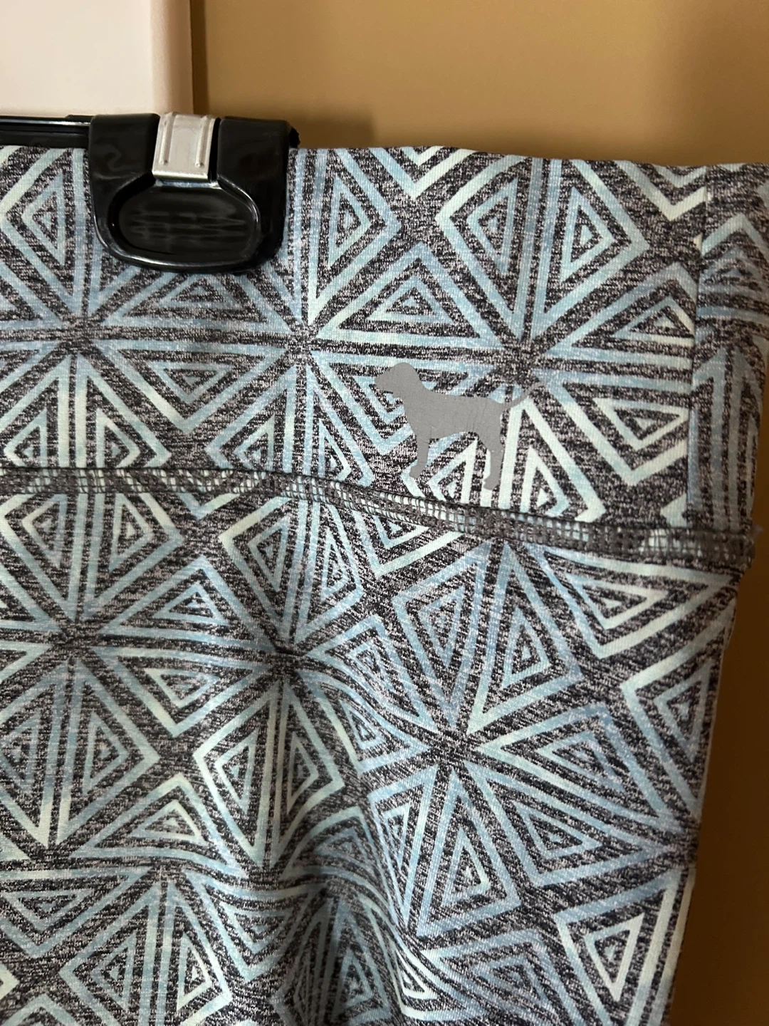 Selling a pair of PINK Yoga leggings in size medium! They feature a geometric pattern in shades of grey and blue. Perfect for yoga or just lounging around