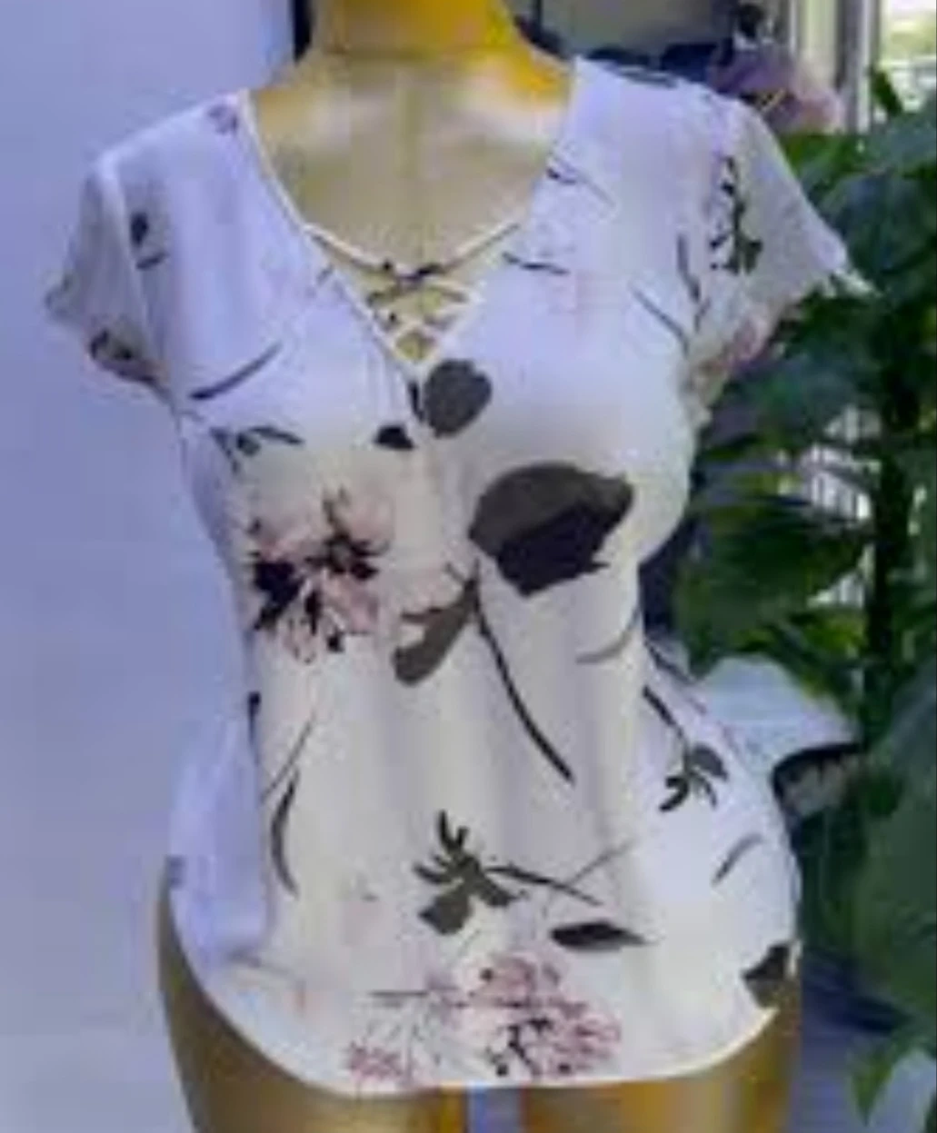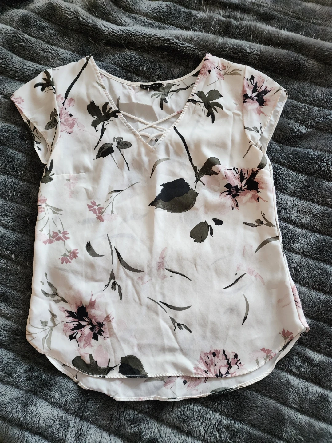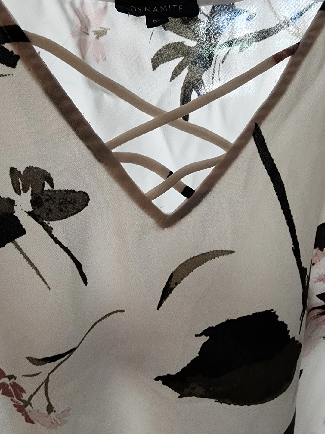 Cute Dynamite blouse with a floral print and criss-cross v-neck design.
