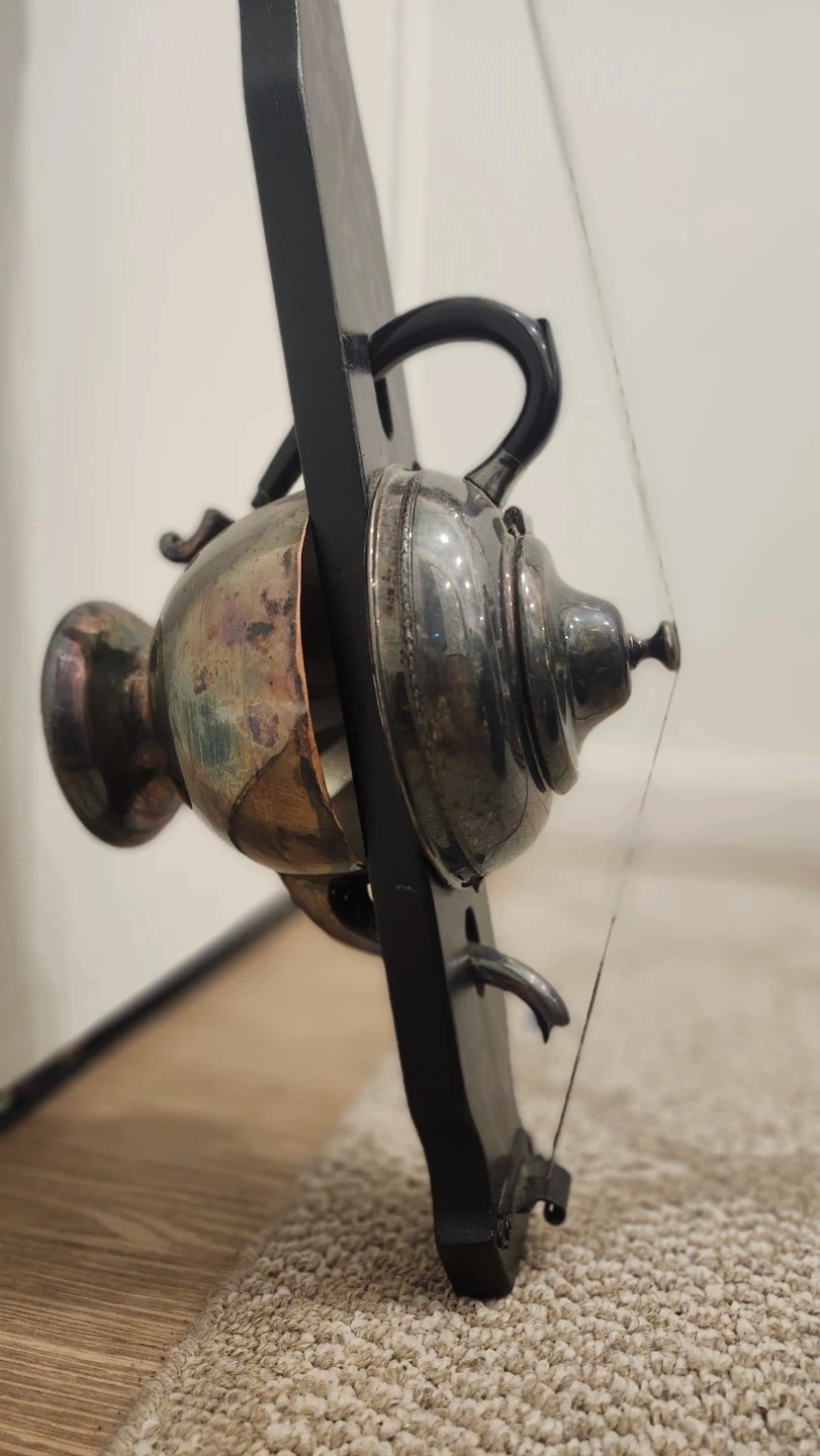 This is a unique decorative wall hanging. It features a black wooden base with a silver-toned metal teapot-like structure attached. It's definitely a conversation starter and adds a touch of whimsy to any room.