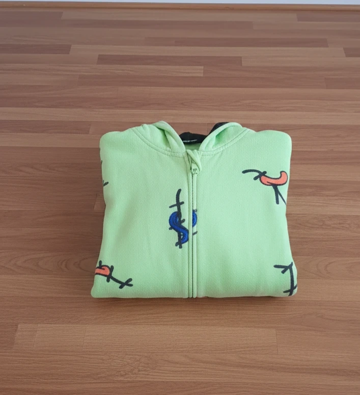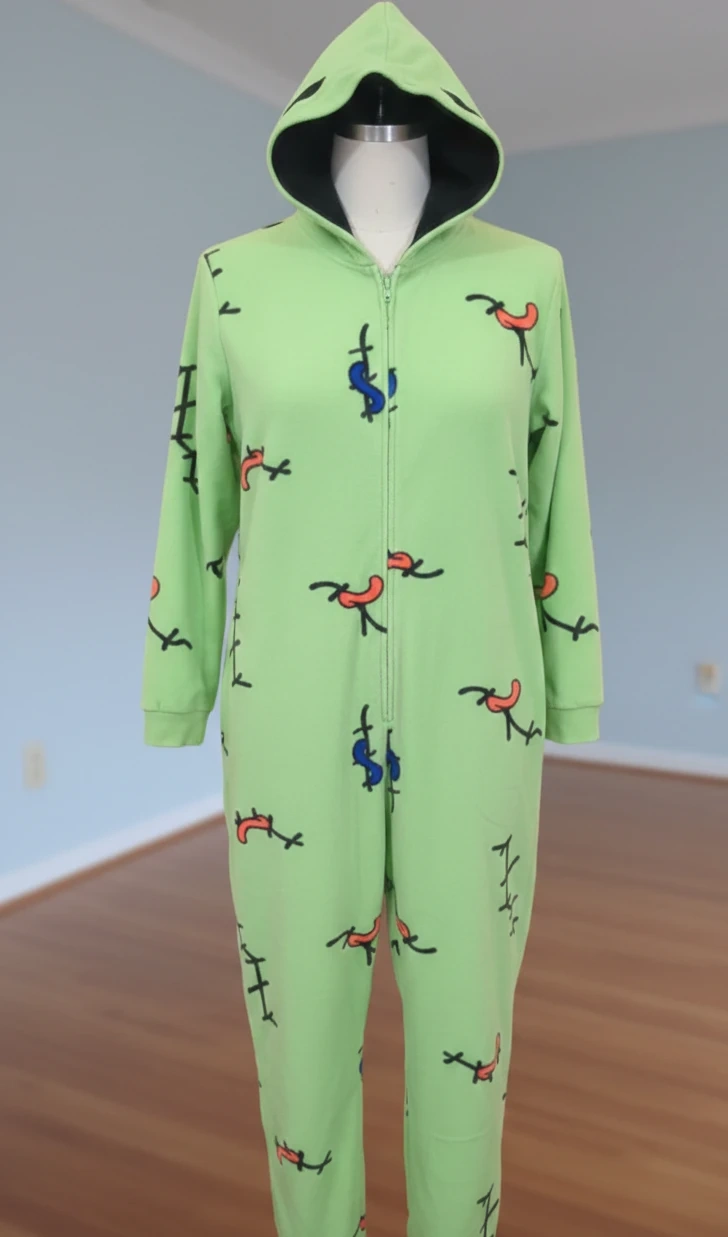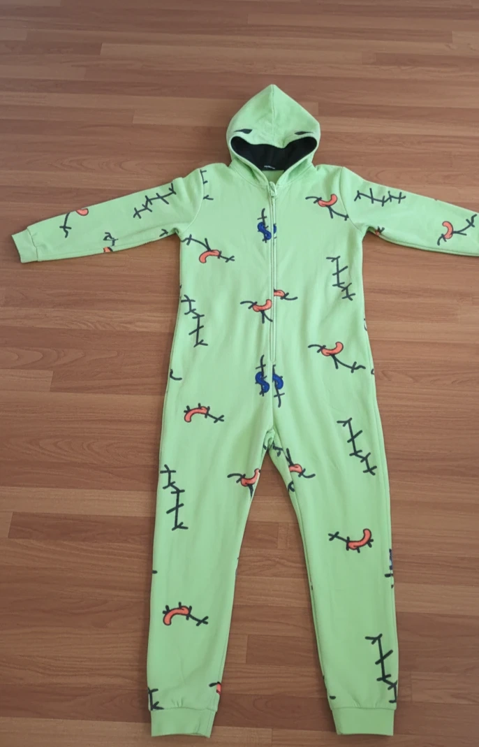 A fun and comfy green onesie featuring a unique design! Perfect for lounging around the house or adding a quirky touch to your wardrobe. Nightmare before Christmas theme.