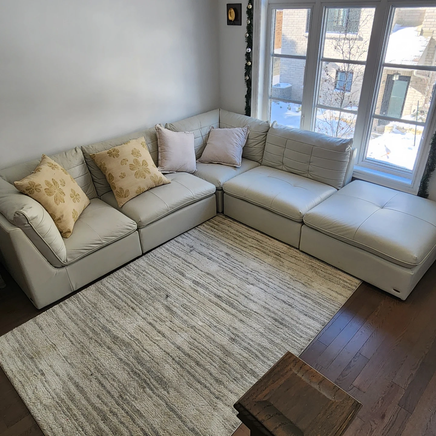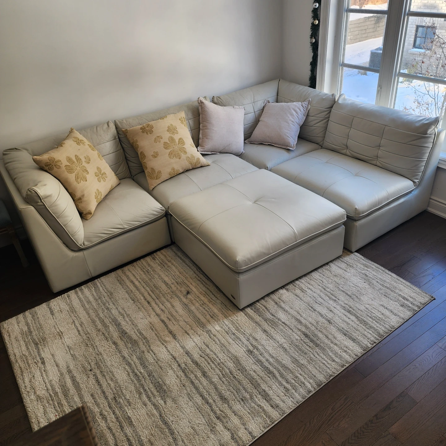 CARPET EXCEPT - Selling a comfortable modular sectional sofa (Leather) in a light grey colour! It’s in great condition and ready to add some coziness to your living space. Perfect for lounging and easy to rearrange to fit your needs