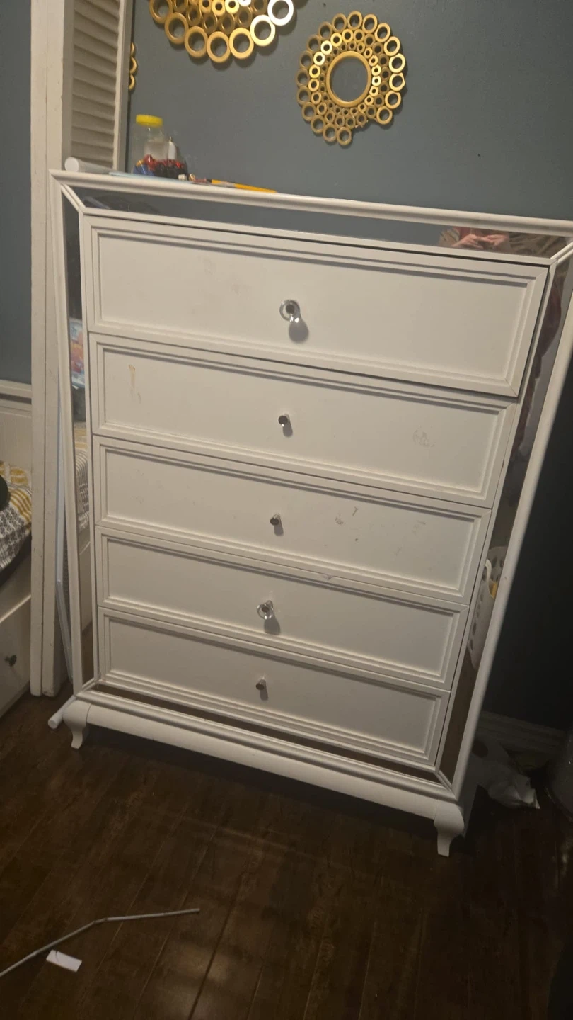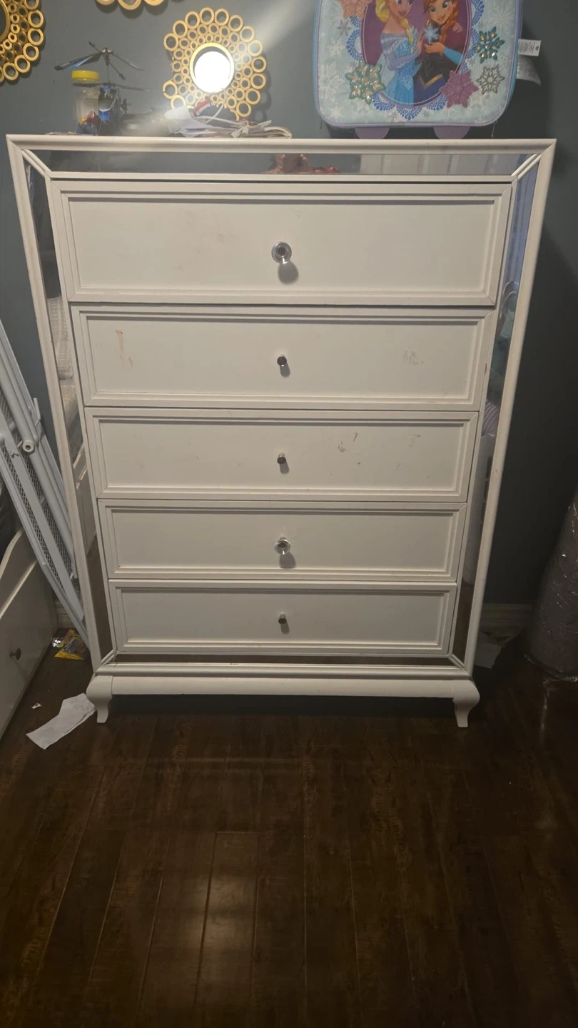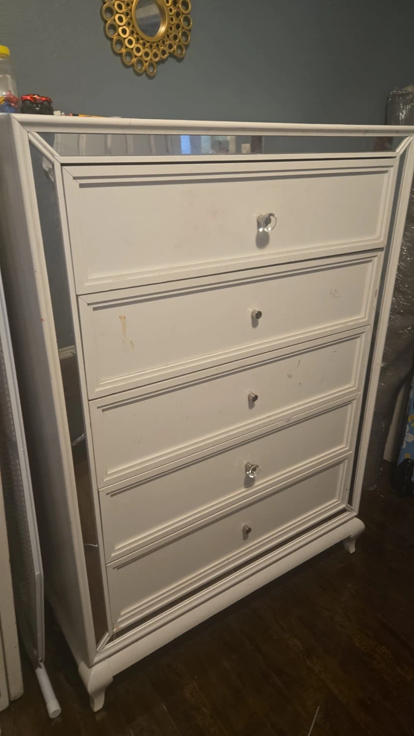 Selling a white 5-drawer chest with mirrored accents. It has some signs of use but is still functional and stylish. Perfect for adding storage and a touch of elegance to any room!