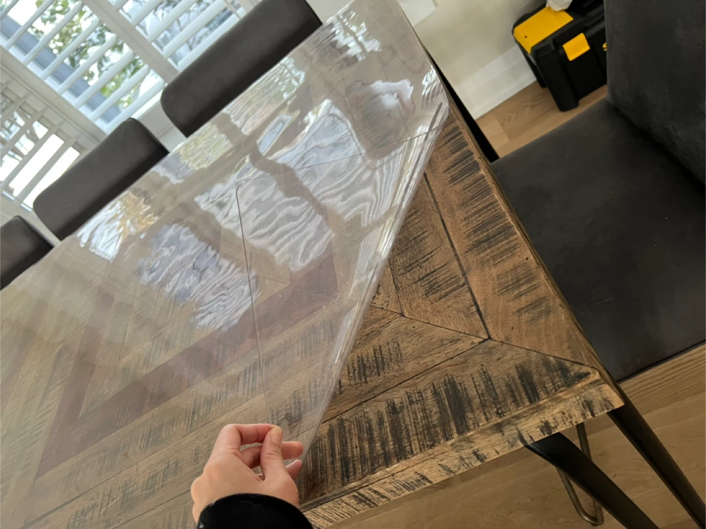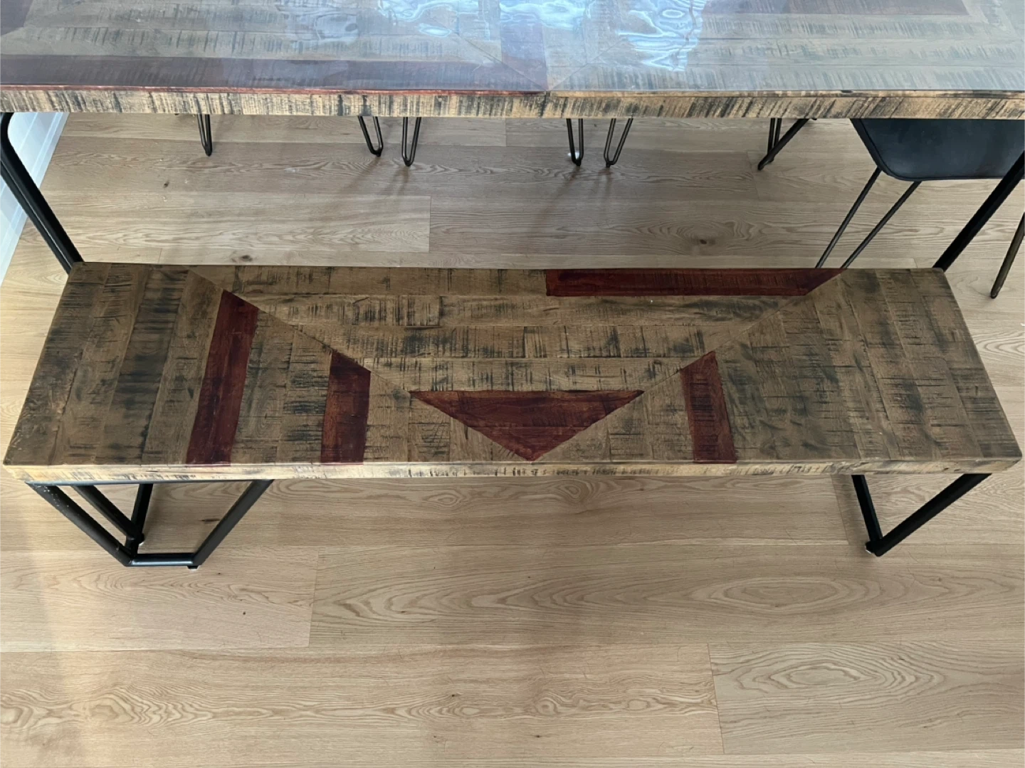 Selling a beautiful rustic wood dining table with a matching bench. The table has a unique geometric design and comes with a custom protective top. Very well maintained and in a like new condition.