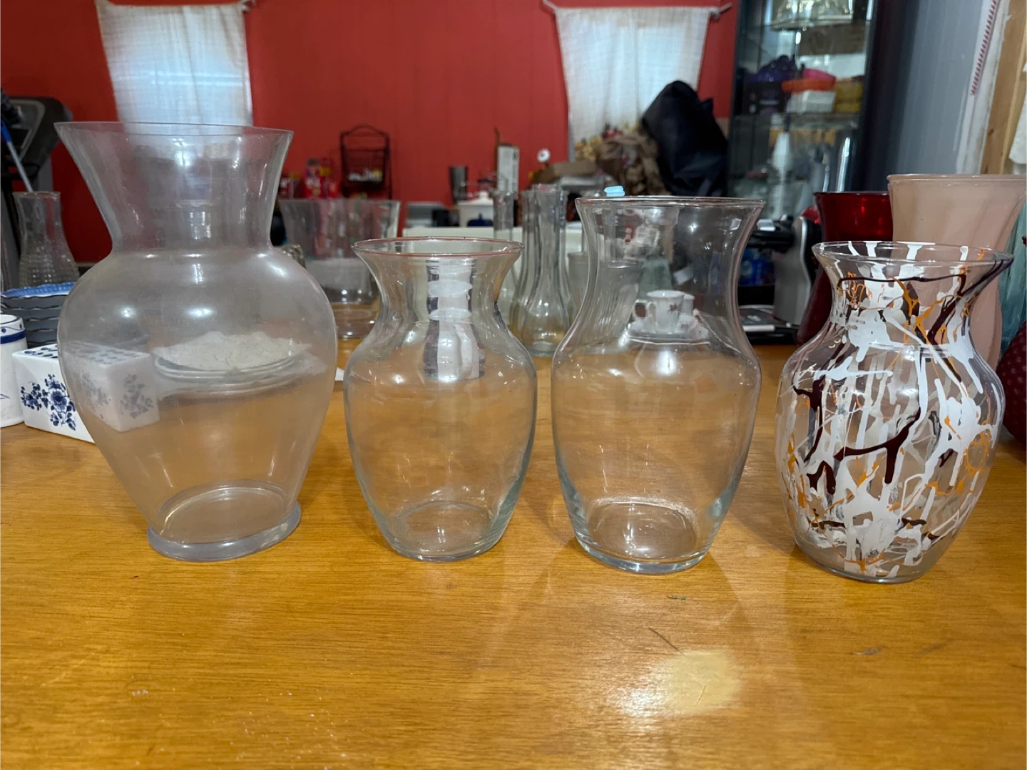 Selling a collection of clear glass vases! They're perfect for displaying flowers or adding a touch of elegance to your home decor. The vases come in various shapes and sizes, including one with a unique painted design