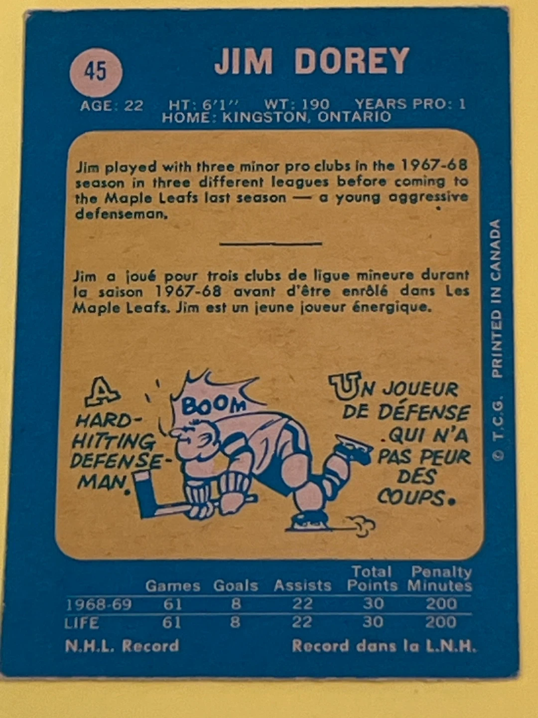 Selling a vintage Jim Dorey Maple Leafs hockey card. It's from when he played defence for the team. A cool piece of sports memorabilia!