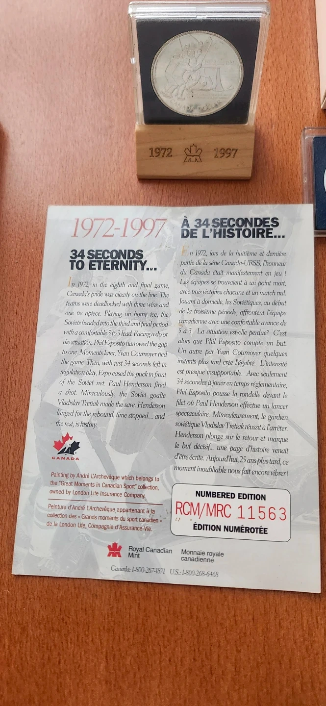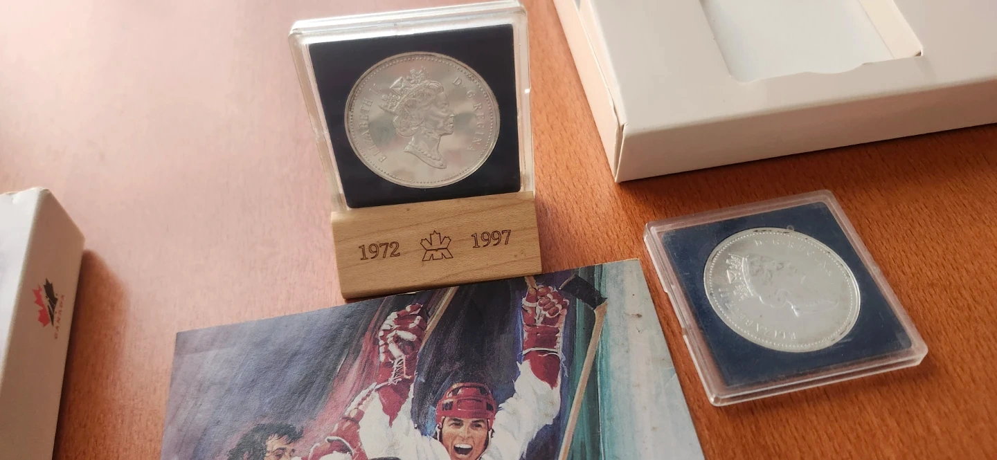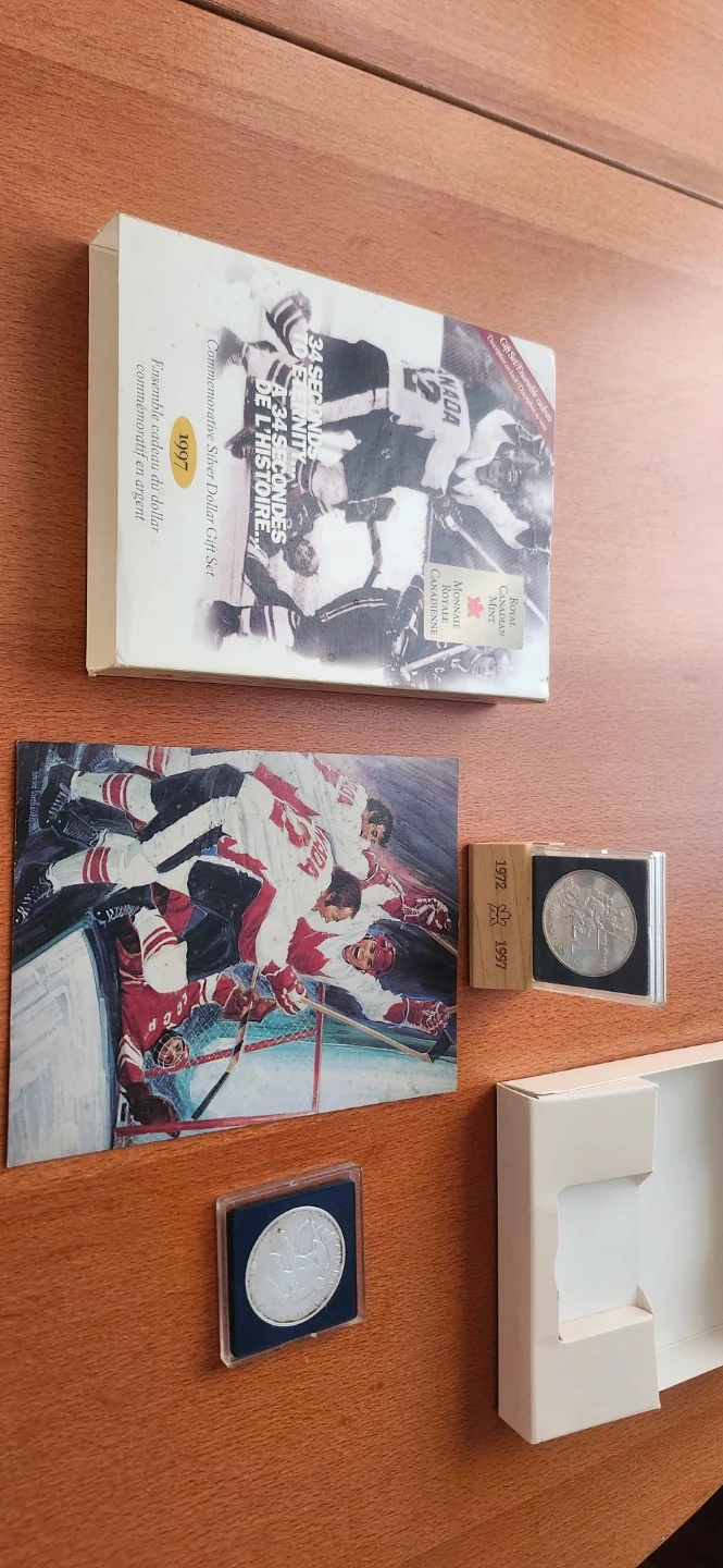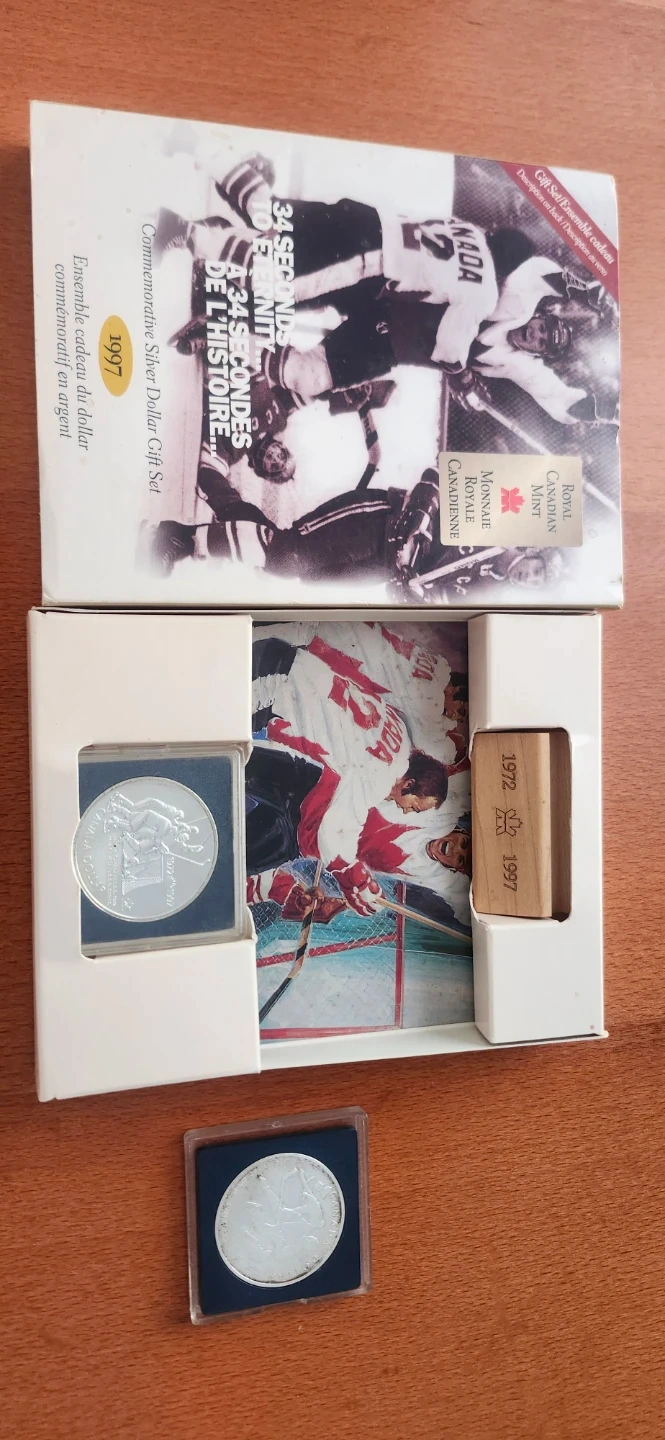 Selling a 1997 Commemorative Silver Dollar Coin Set. The set celebrates the 1972 Canada-Soviet hockey series. Includes the original box and informational insert. Numbered edition RCM/MRC 11563. As well as a 1993 Stanley cup silver dollar