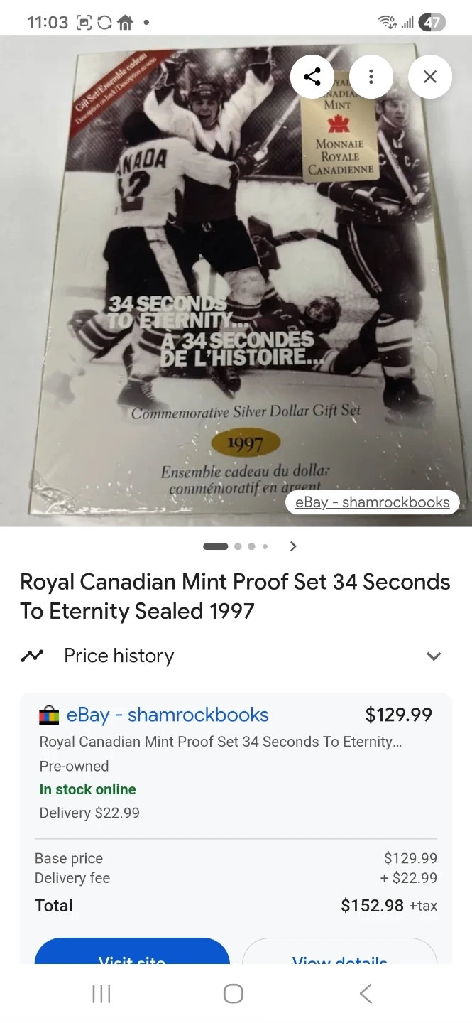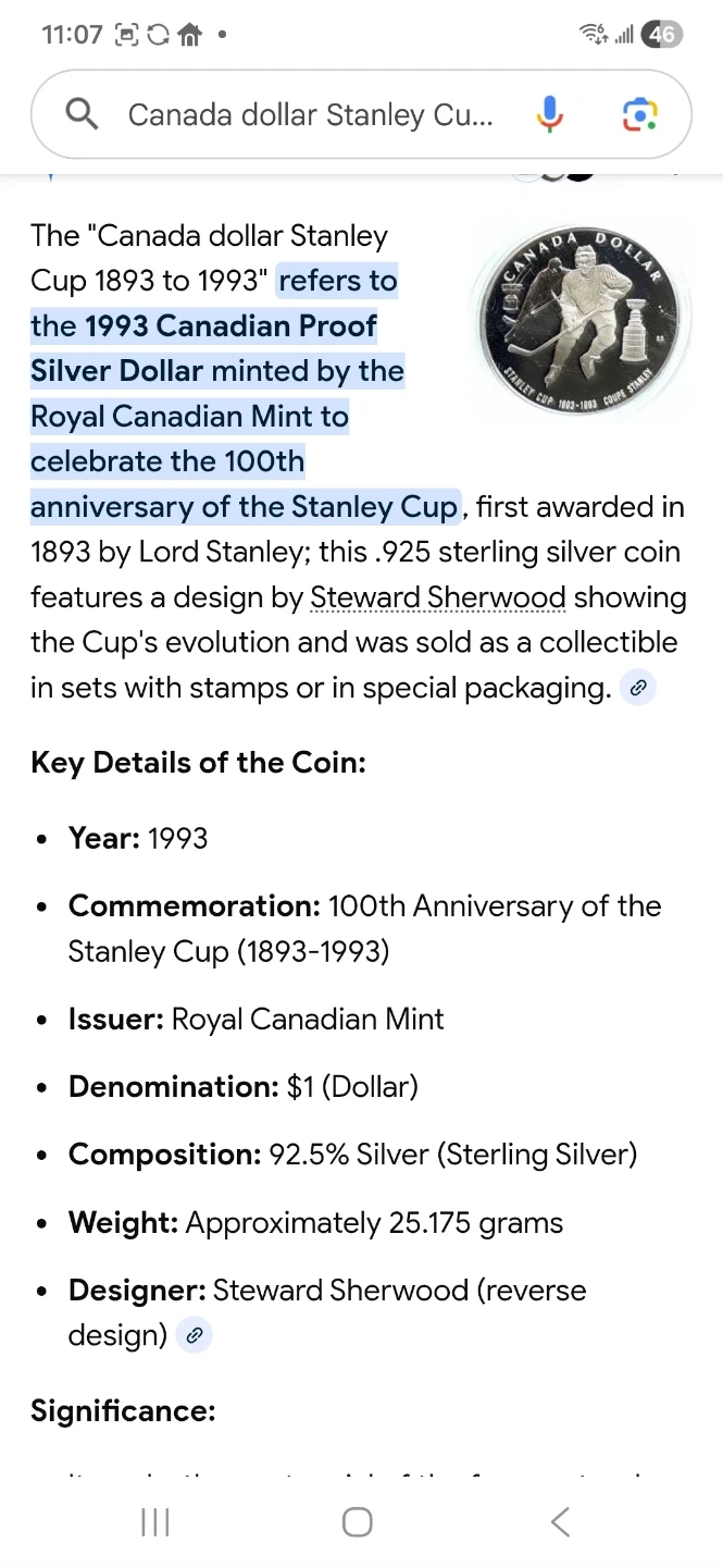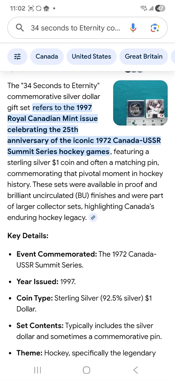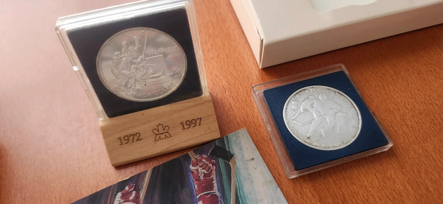 Selling a 1997 Commemorative Silver Dollar Coin Set. The set celebrates the 1972 Canada-Soviet hockey series. Includes the original box and informational insert. Numbered edition RCM/MRC 11563. As well as a 1993 Stanley cup silver dollar