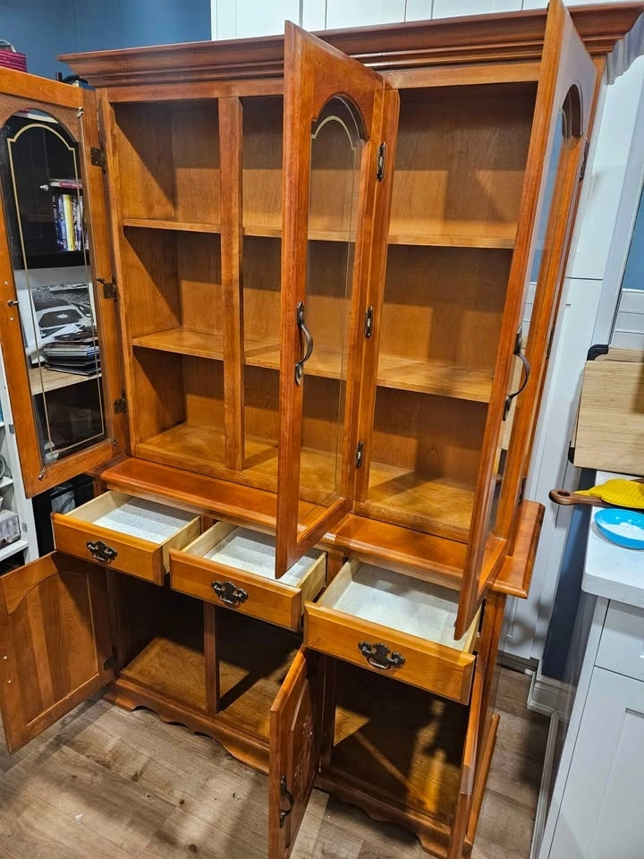 Warm wood tone with glass-front upper cabinets, adjustable display shelves, and three lower drawers with additional cabinet storage below. Original hardware and classic carved details.