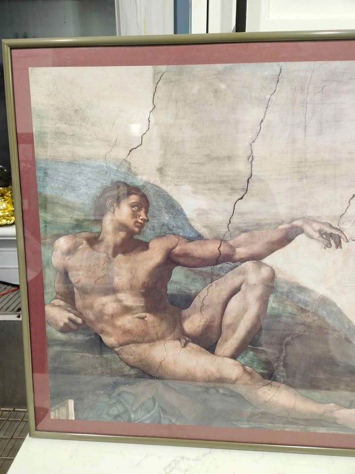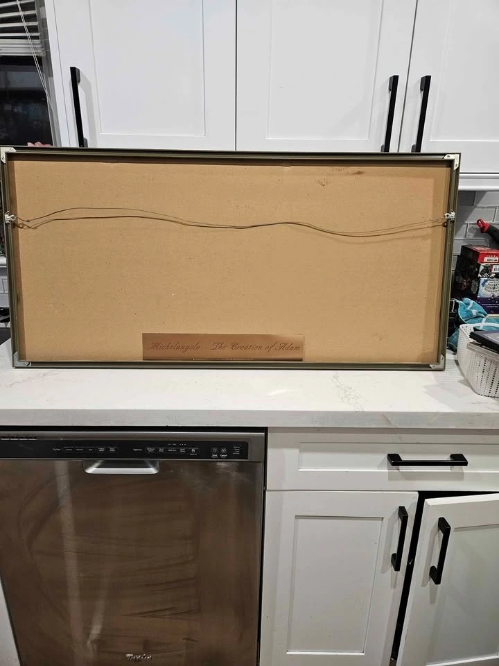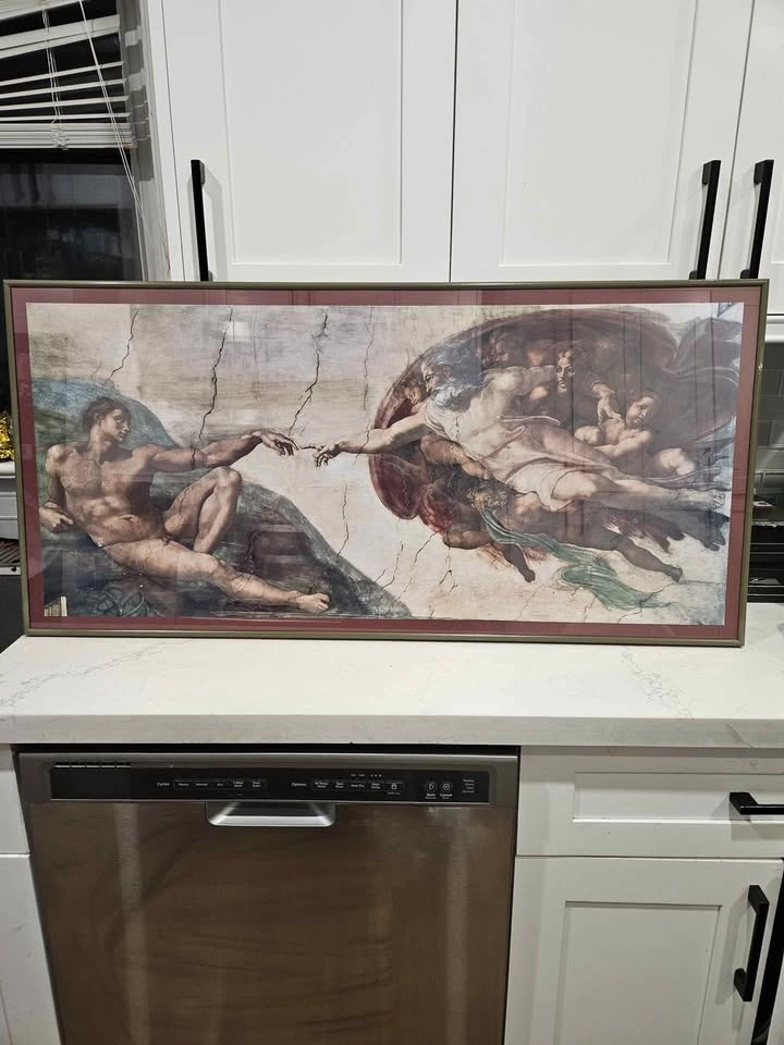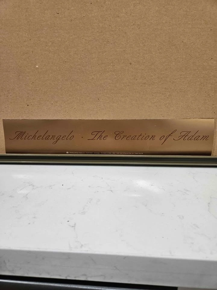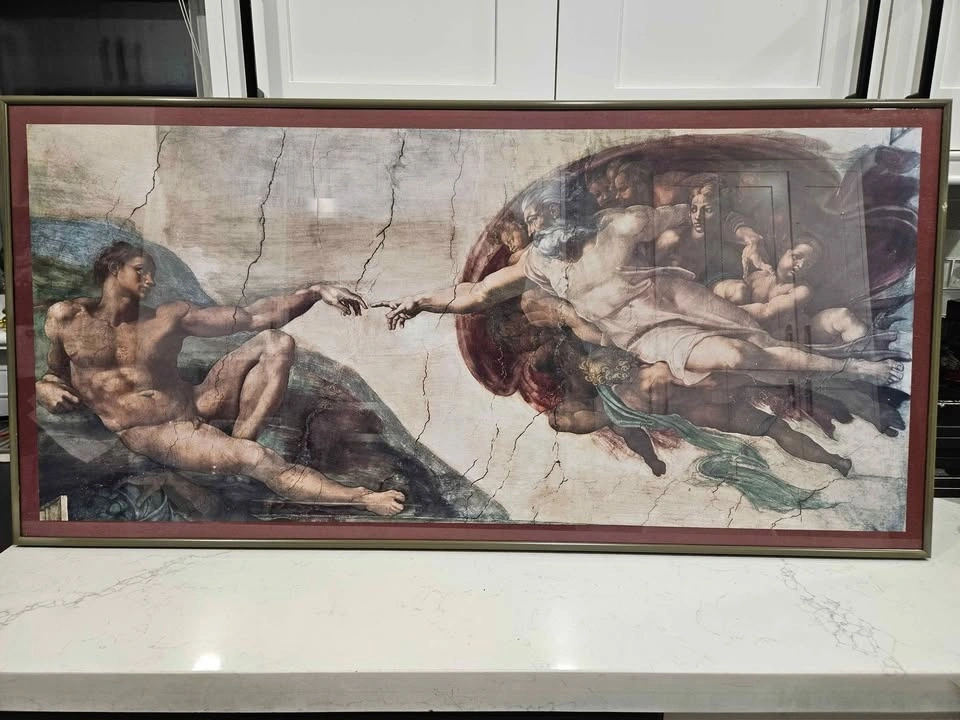 Large framed art print of Michelangelo’s The Creation of Adam, one of the most iconic works in art history.