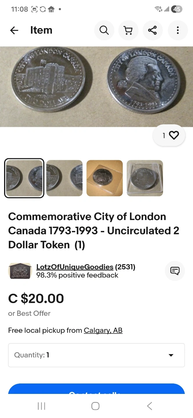 Buy & SellCommemorative City of London Canada 2 Dollar TokenCommemorative City of London Canada 2 Dollar Token$20Selling a commemorative City of London Canada 1793-1993 uncirculated 2 dollar tokenWHERE TO MEETWindsorView MapSELLERJohnS Central211 review0 chats·0 favorites·14 viewsSEND CHAT TO SELLERHi John! I’m interested in your listing.Hi John! I’m interested in your listing.Get the Karrot app to chatSign In to chat