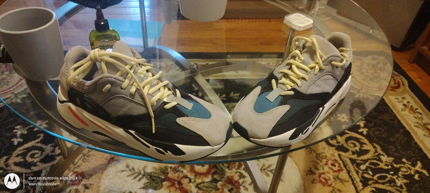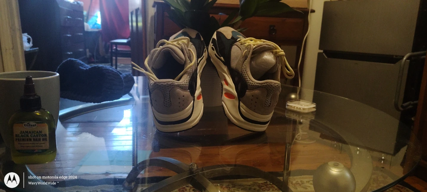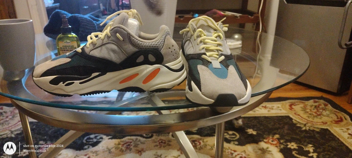 Selling a pair of Adidas Yeezy Boost 700 Wave Runner sneakers. These are a stylish and comfortable option for everyday wear. The shoes feature a blend of grey, black, and teal colors with orange accents on the midsole. They are in good condition and ready for a new owner! Make me your best Offer.