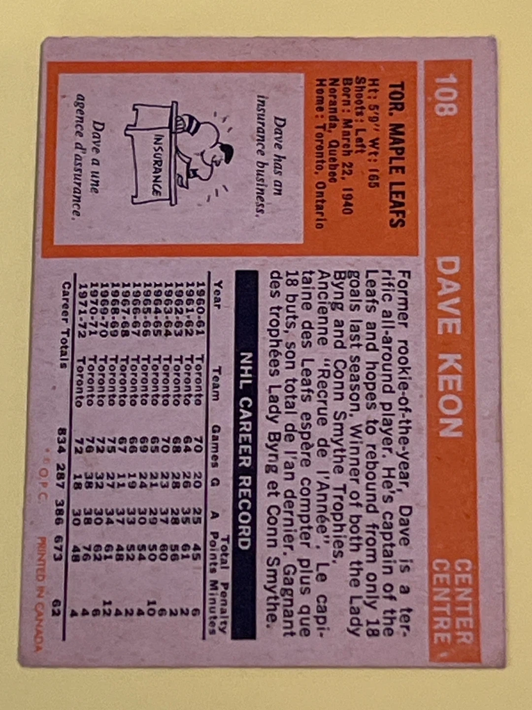 Selling a Dave Keon Toronto Maple Leafs hockey card. A great piece for any hockey fan or collector! The card shows Dave Keon in his Toronto Maple Leafs uniform. The back of the card provides his NHL career record and some biographical information.