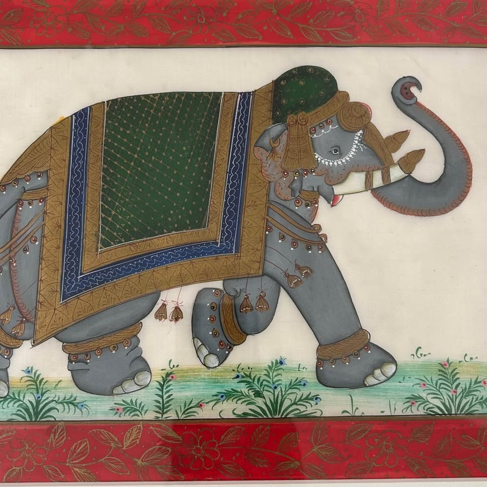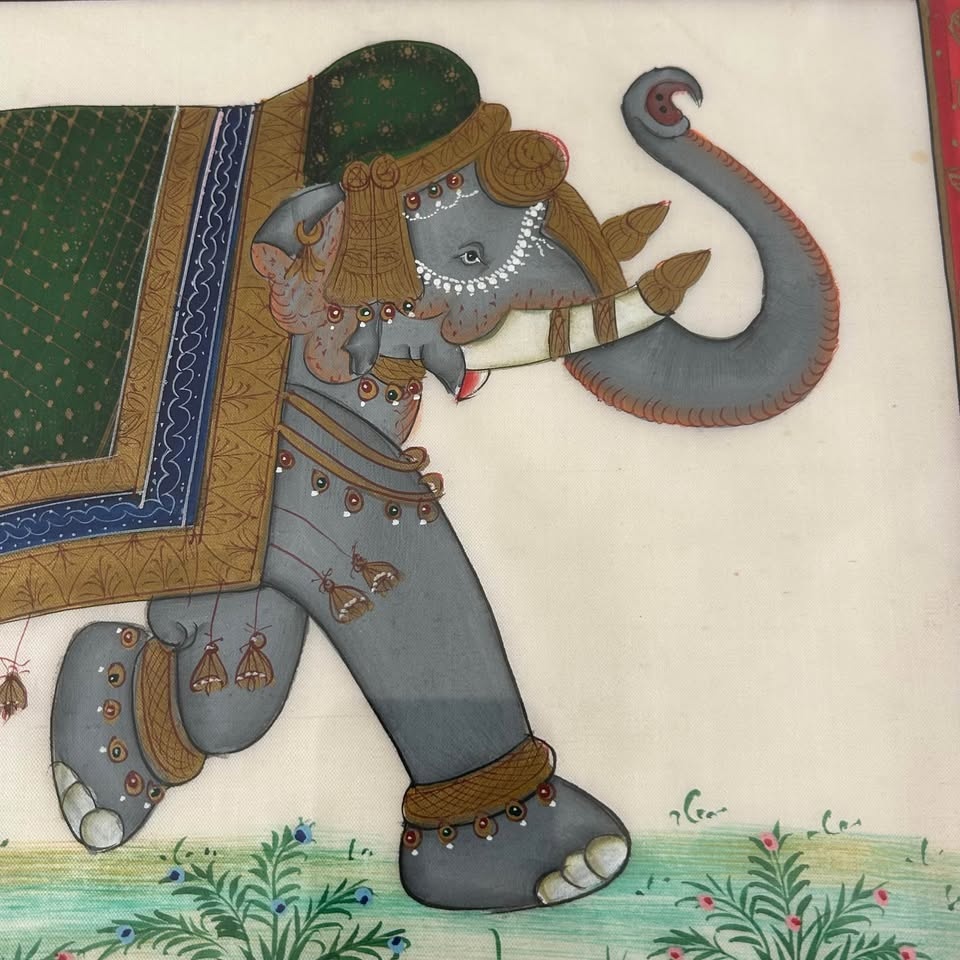 Beautiful collectible hand-painted Indian artwork created on fabric using traditional miniature-style techniques. The elephant is richly decorated with gold accents and detailed brushwork, showcasing classic Rajasthani / Mughal artistic motifs.