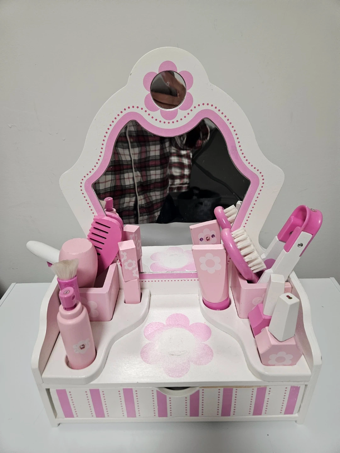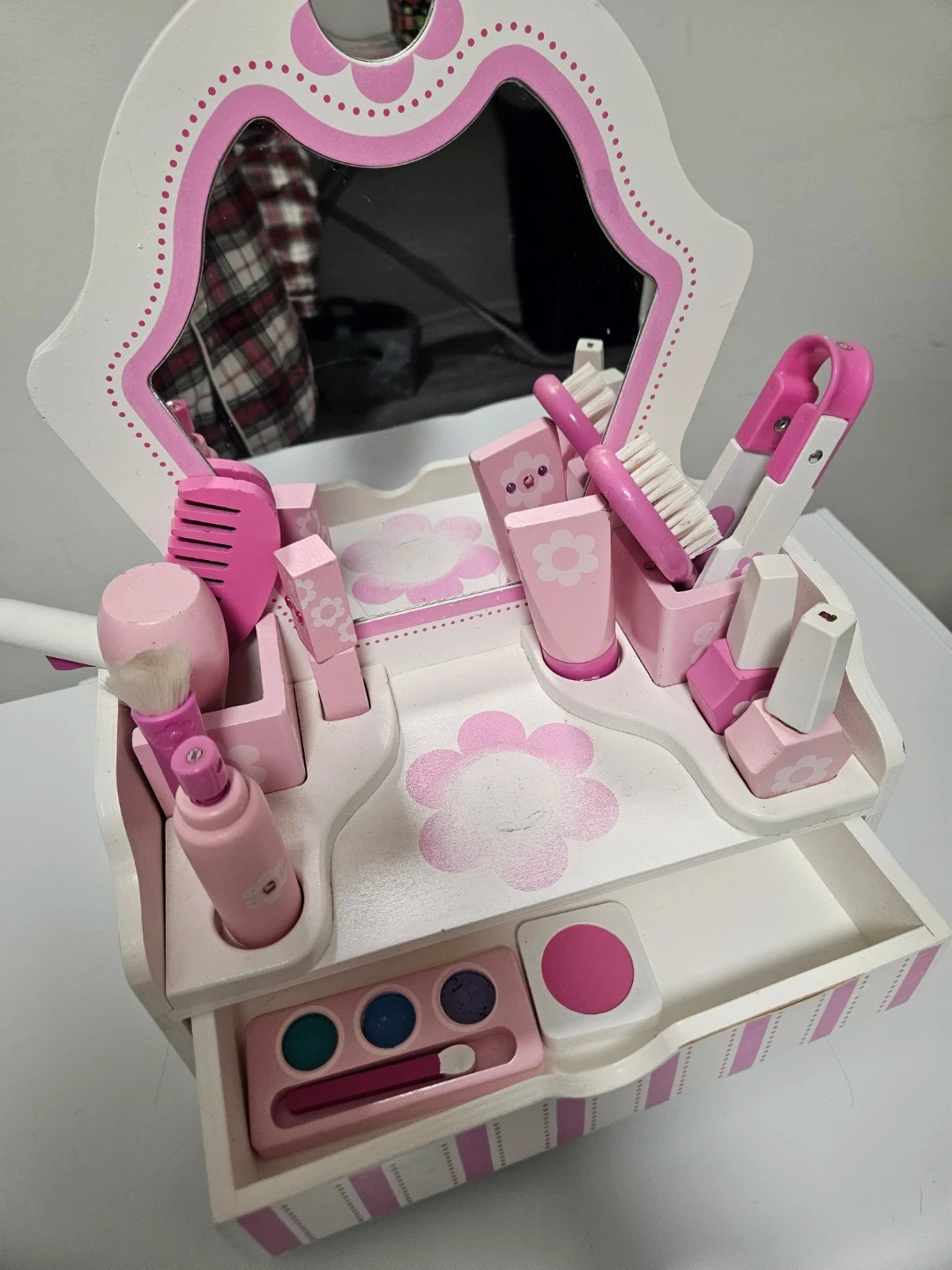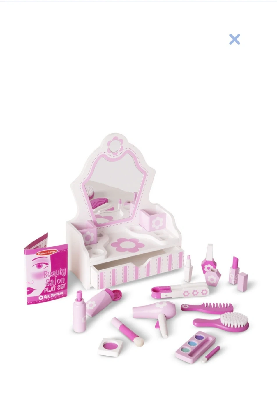 This Melissa & Doug Wooden Beauty Salon Play Set is perfect for creative play! It comes with a variety of accessories to spark imagination. Originally bought for $89.99, it's in great condition and ready for a new stylist!