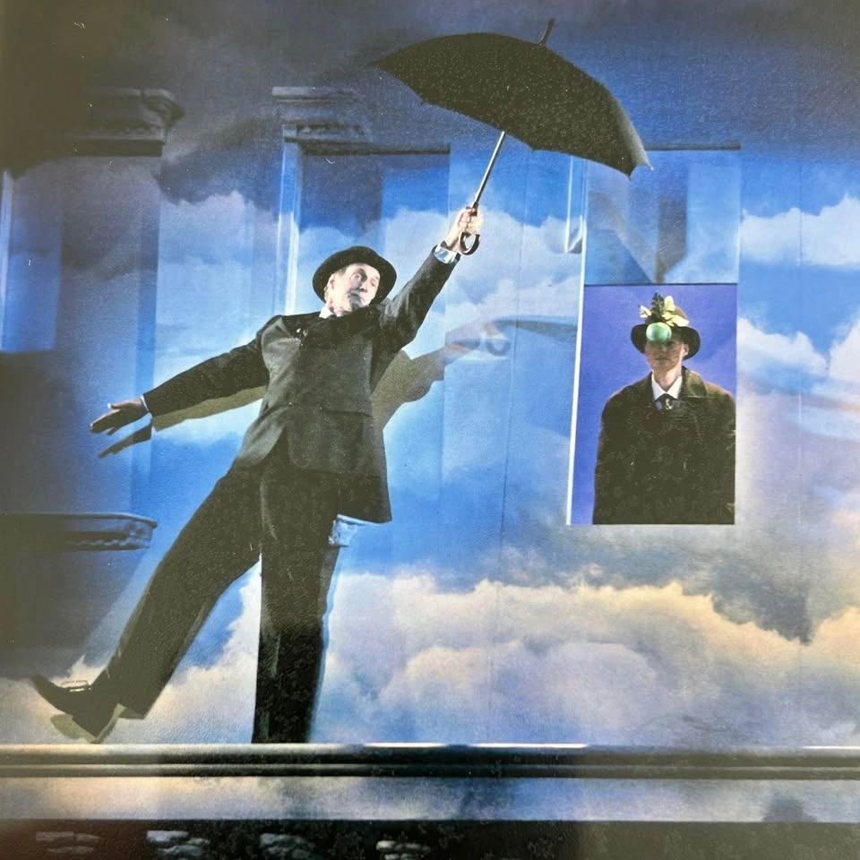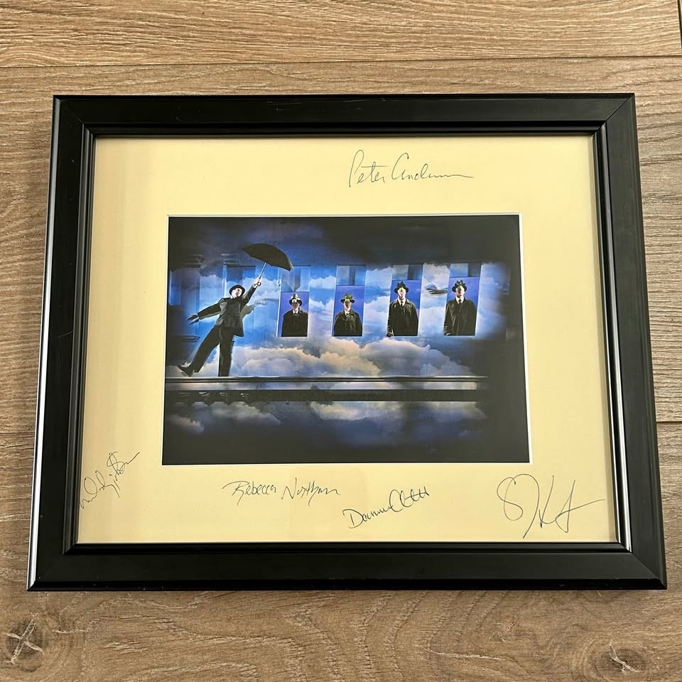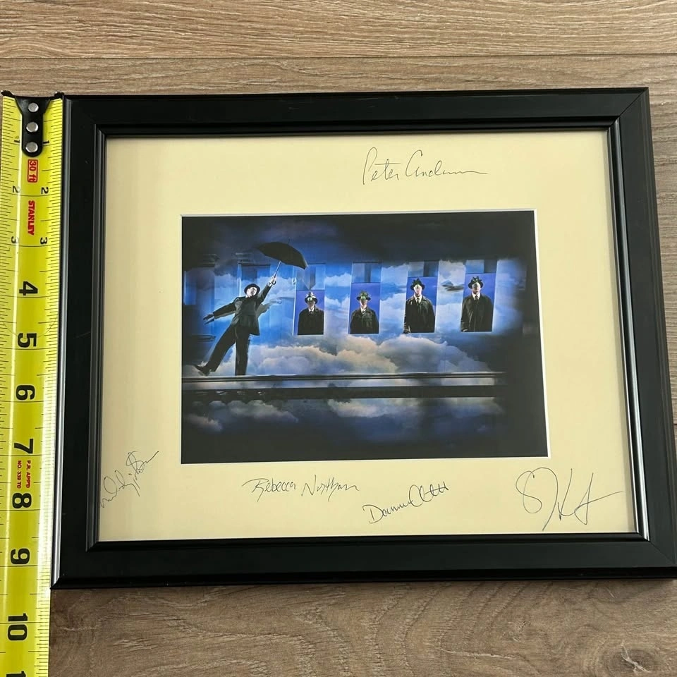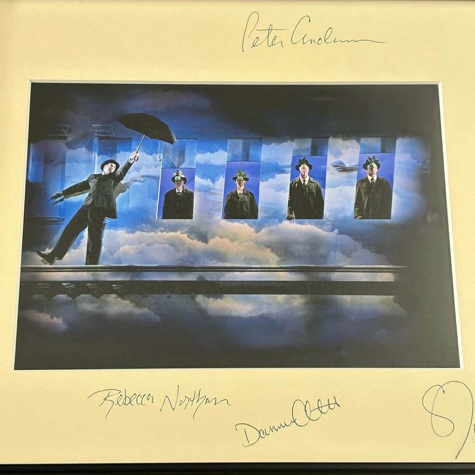 This piece features a vivid surrealist-style stage scene photographed by Trudie Lee, mounted under a cream mat and presented in a sleek black frame. The mat is hand-signed by multiple cast members, including: