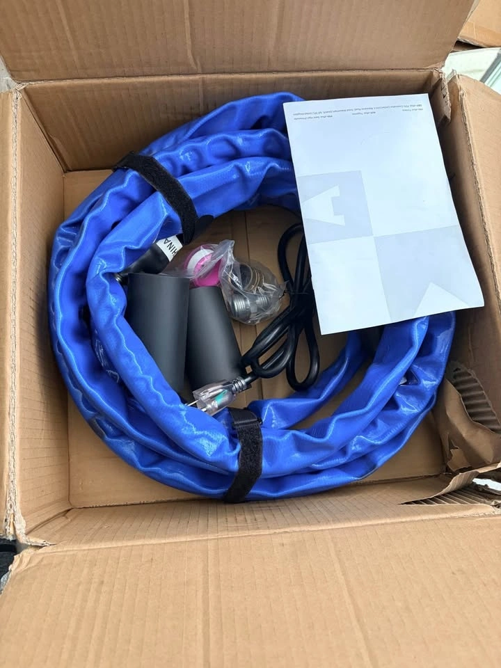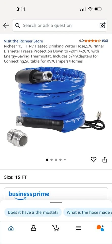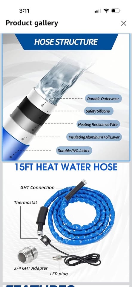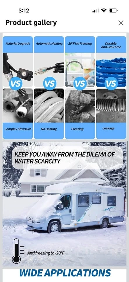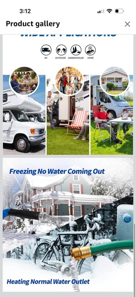 New in box, 15 ft heated RV hose. The heating power automatically adjusts to the ambient temperature. When it detects the water temperature is below 47°F(5°C), the heating system starts. It stops when the water temperature reaches 60°F (15.5°C). It can withstand water pressure of up to 450PSI and has strong cold resistance, ensuring unobstructed water flow in extremely cold winter.