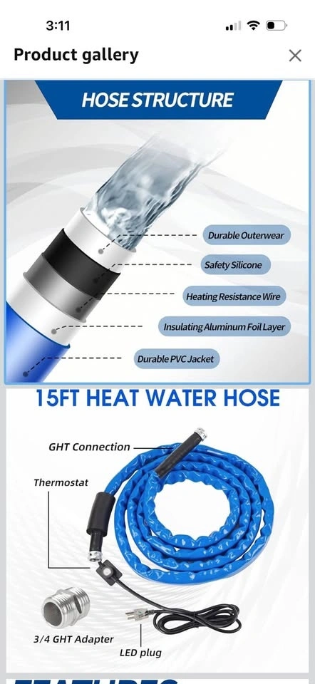 Provides antifreeze protection through an intelligent heating control system; even if the outdoor temperature drops to -20 ° F, it will not freeze water in the hose. Hose is 15FT long,inner diameter of 5/8 inches (16mm),outer diameter of 7/8 "(22 mm),the working voltage is 120VAC,non-toxic & safe.