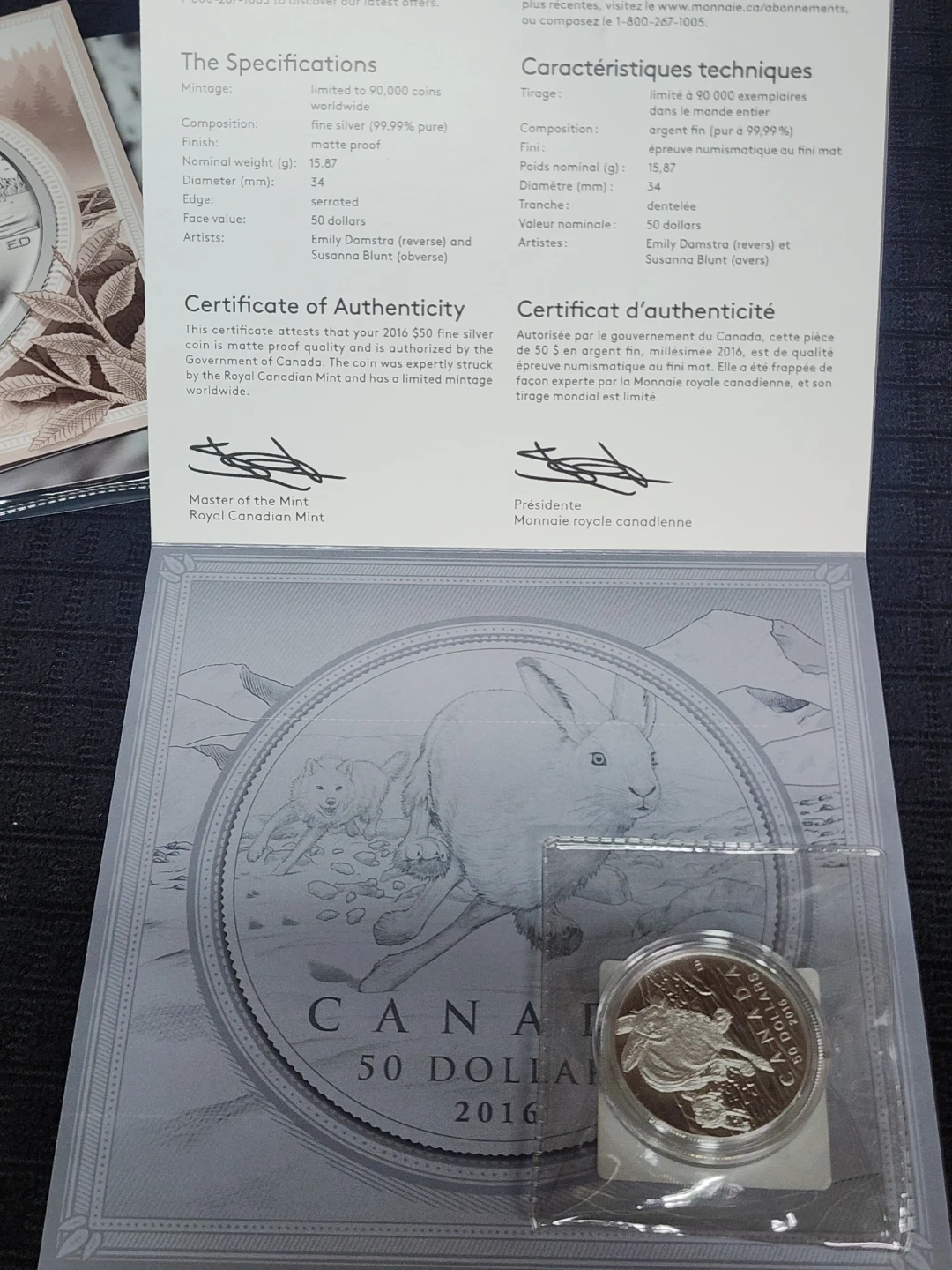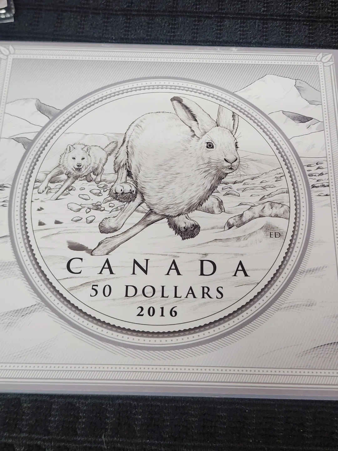 Selling a 2016 Canada $50 fine silver coin featuring the Arctic Hare! This coin is made of fine silver (99.99% pure) with a matte proof finish. It has a nominal weight of 15.87 g and a diameter of 34 mm. The edge is serrated. The artists are Emily Damstra (reverse) and Susanna Blunt (obverse)