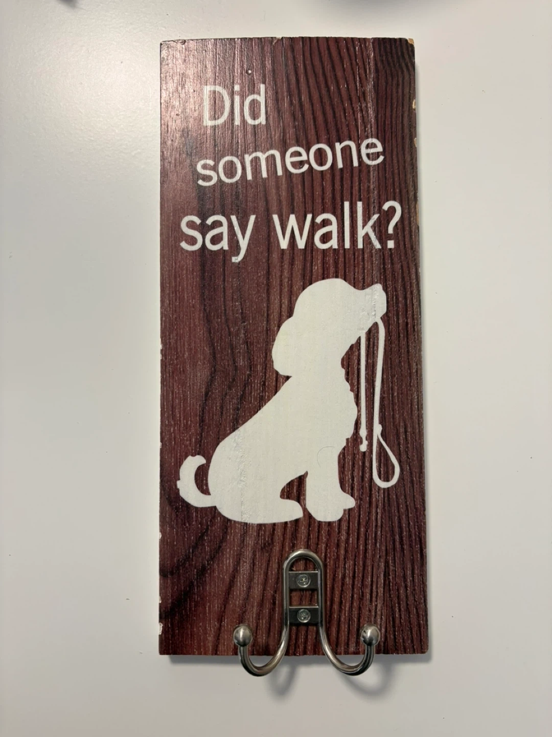 Cute dog leash holder with the phrase 'Did someone say walk?' and a little dog illustration. It also has two hooks for hanging leashes or other small items