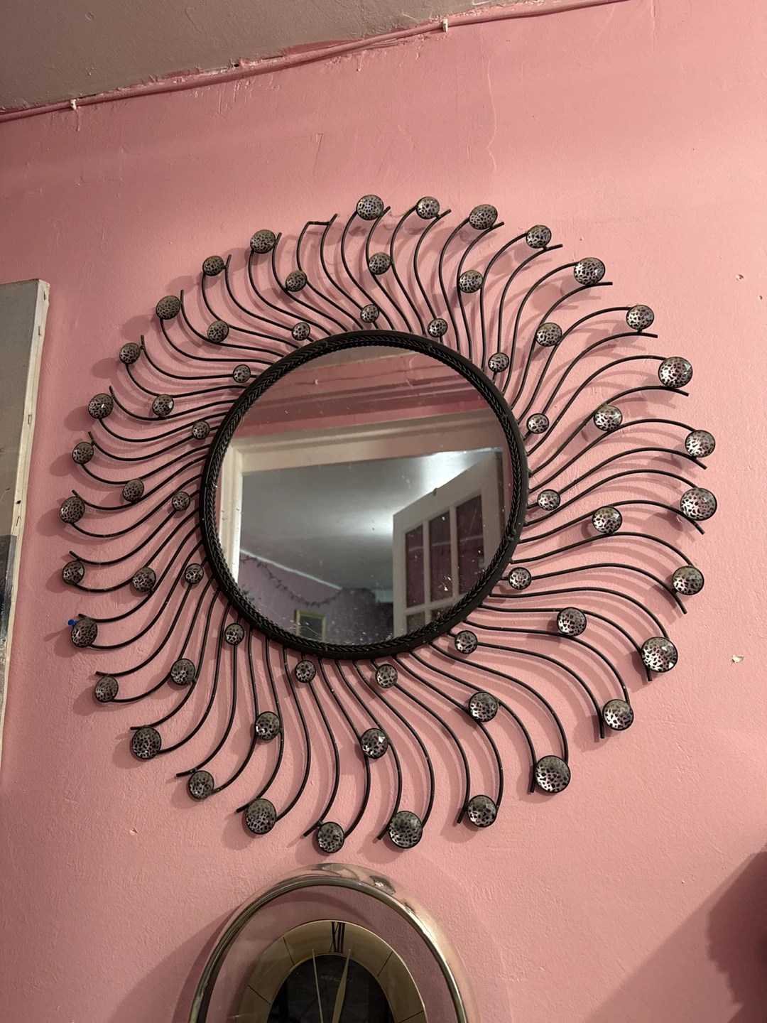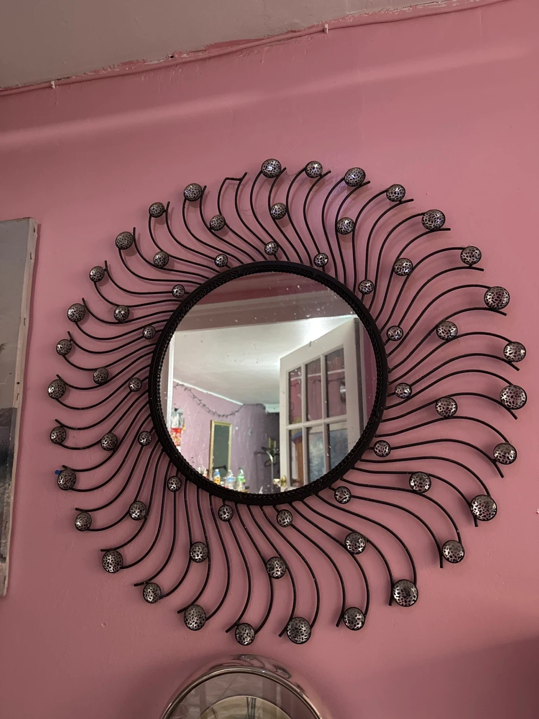 This is a decorative round wall mirror with a unique sunburst design. It features a black metal frame with small, round decorative accents. It's in great condition and would add a stylish touch to any room