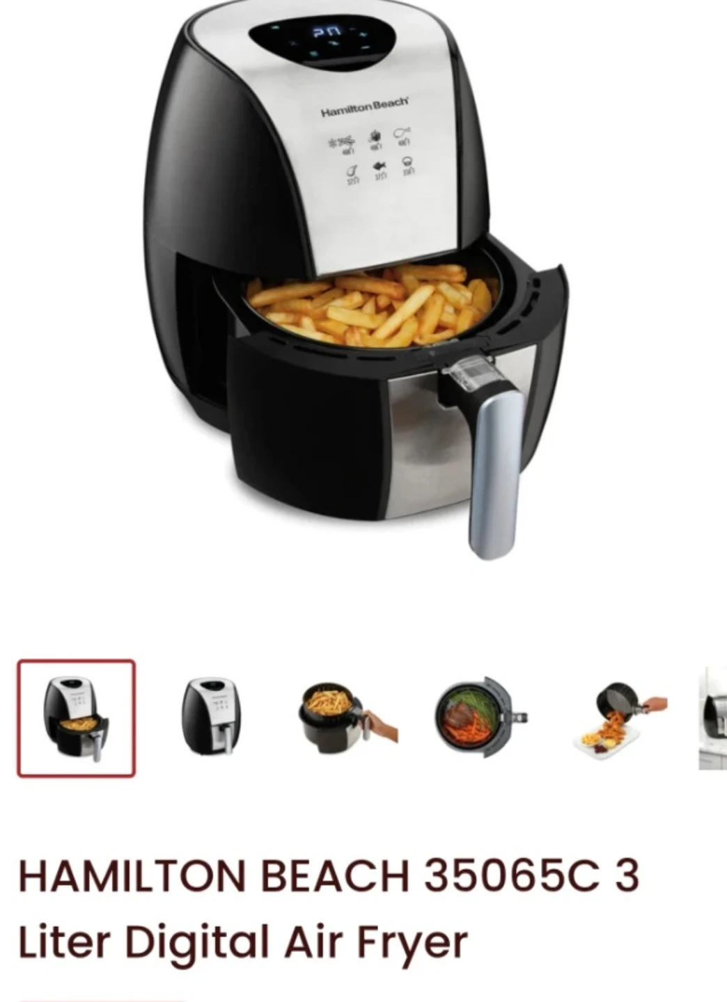 The item pictured is a Hamilton Beach 3.2 Quart Digital Air Fryer, model 35065.