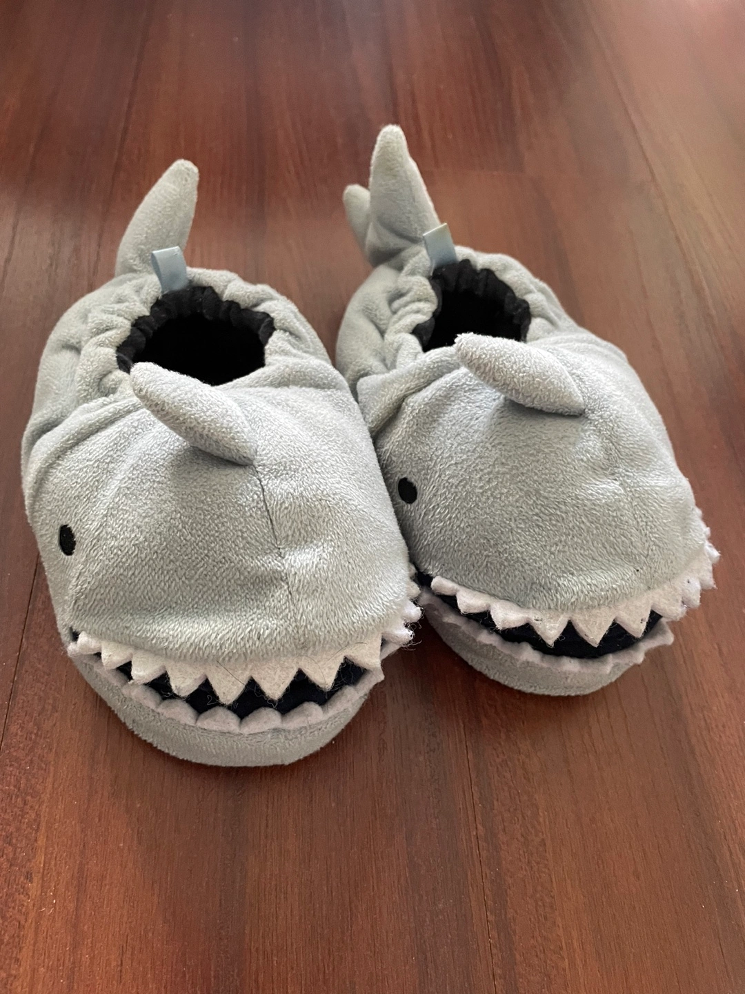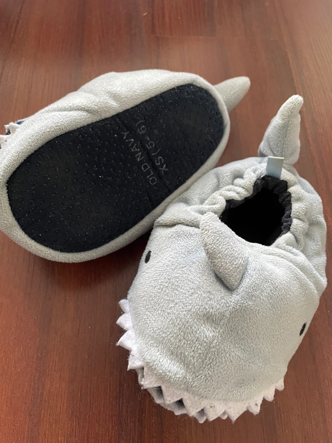 Super cute Old Navy shark slippers! They're a size XS, which fits sizes 5-6. Perfect for keeping little feet warm and cozy!