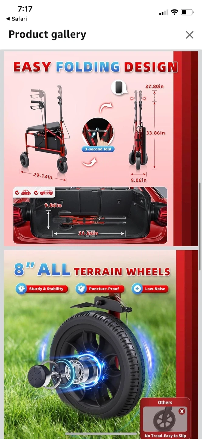 THREE 8-INCH ALL-SURFACE WHEELS: 8-inch non-slip tires grip hardwood and snowy ramps; 360-degree front wheel spins tight circles in elevator lobbies; Quiet roll across laminate floors during night bathroom visits