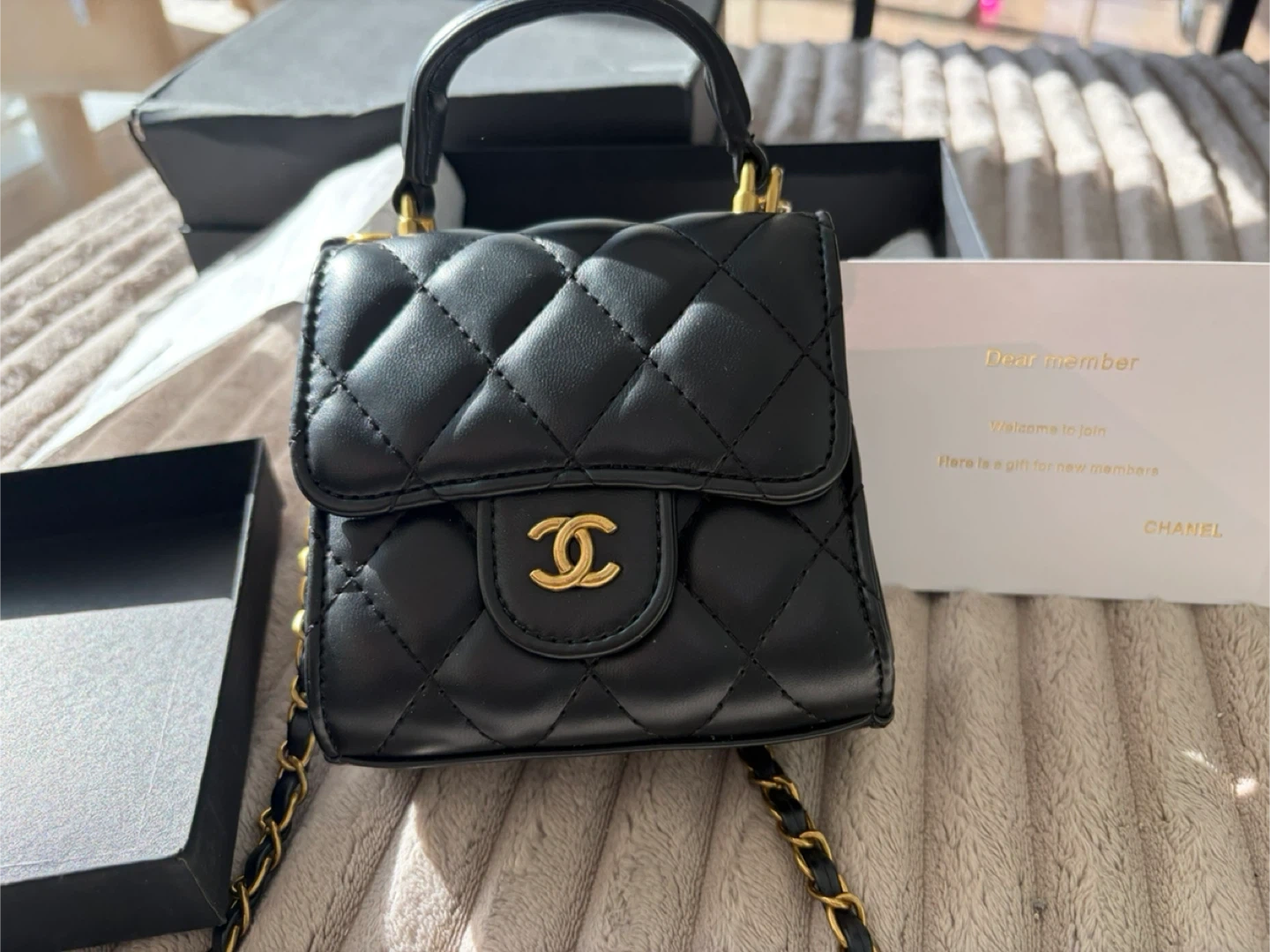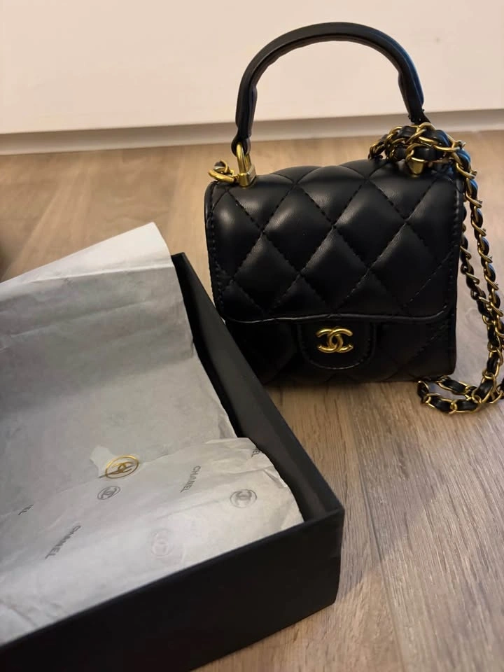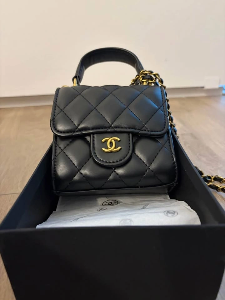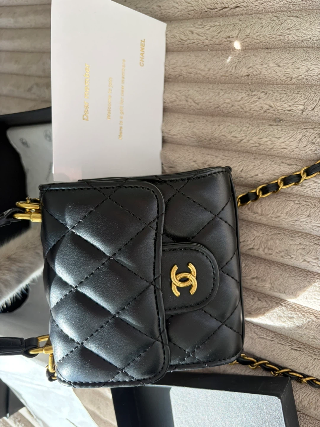 Mini beauty bag in black quilted leather with gold-tone hardware. This item was received as a gift with a beauty purchase.
