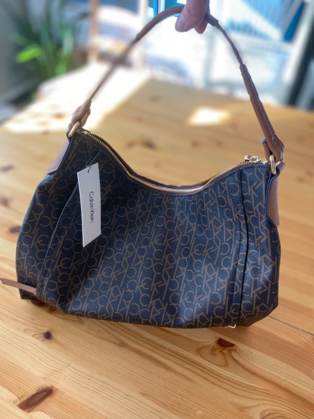 Here's a stylish Calvin Klein shoulder bag! It features a brown signature print design. The bag is brand new. Never used with tag. Purchased for $218.00. It's perfect for everyday use or a night out